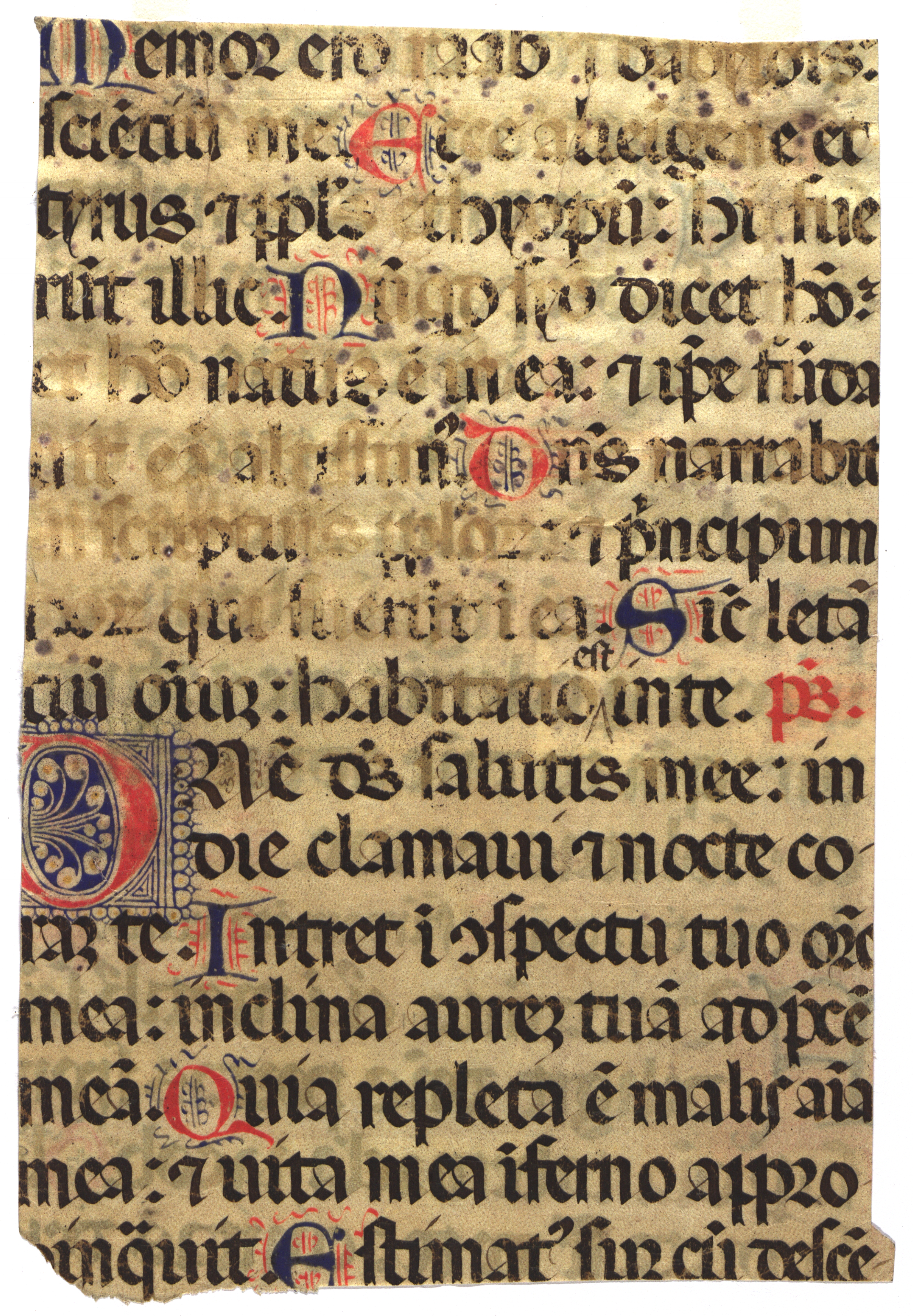 Fragments no Vecās Derības, psalmi: Ps. 85:14-17; Ps. 86:1-7; Ps. 87:2-5. Pergaments (lapa ar nogrieztām malām), polihroms teksts (gallu tinte, tempera) uz abām lapas pusēm. Teksts vietām padzisis - pigmenta nobirums. Teksta nogriezumi minimāli (cietuši atsevišķi burti). Lombardi sarkanā un zilā krāsā (gan vienas, gan divu rindu augstumā). Restaurējusi restauratore-meistare Ārija Ubarste 2006. gadā.