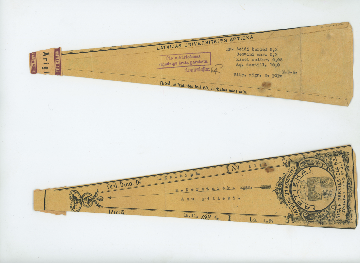 | dc.description | A filled label from the University of Latvia (UL) pharmacy. The UL pharmacy was opened in 1923 at Elizabetes Street 63, Riga, as an internship place for students of the Pharmacy Department of the Faculty of Chemistry. It existed until 1944. The UL pharmacy label is kept in the UL Museum's UL History collections. Photograph dimensions - 1478 x 1080 px. | en_US |