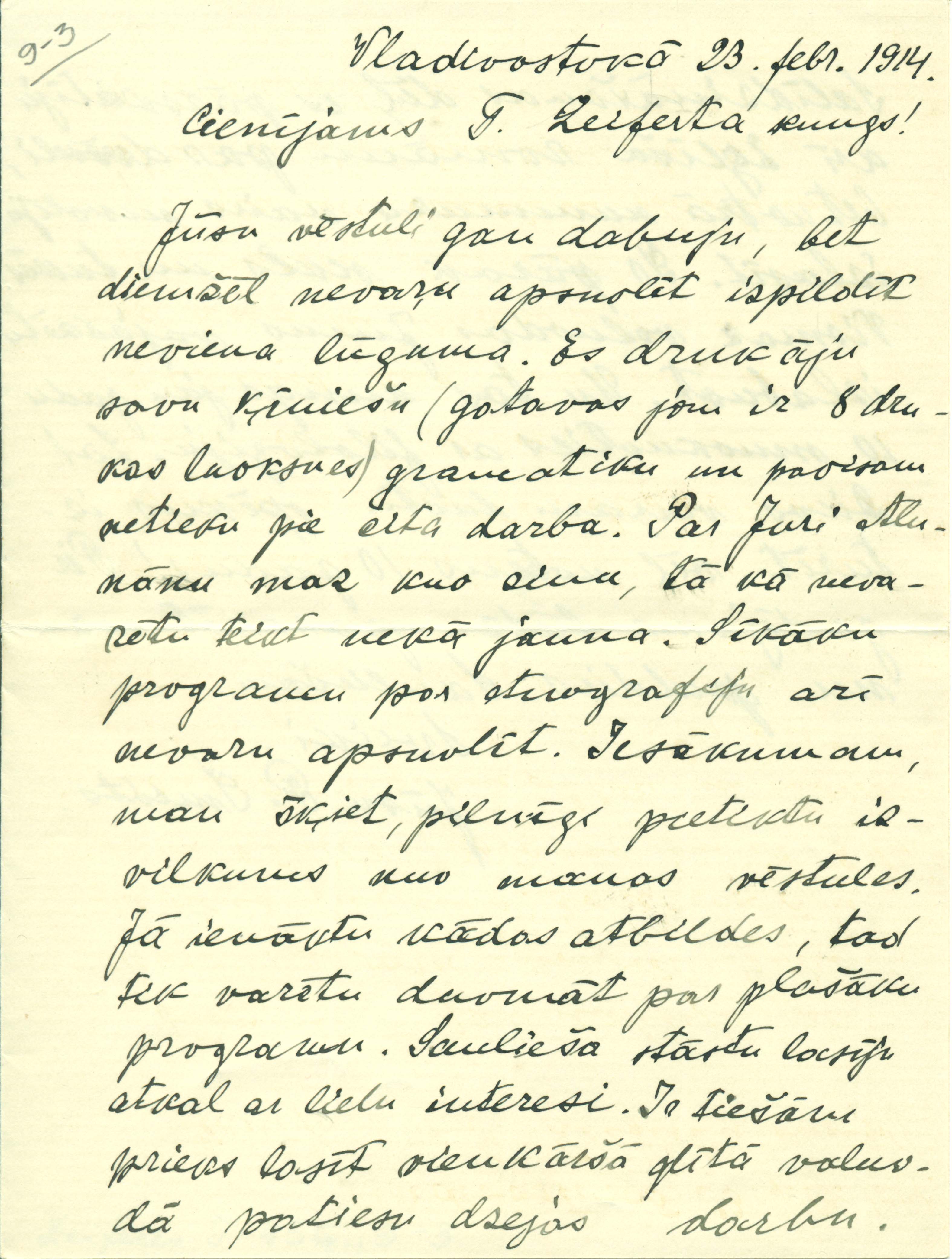 Pētera Šmita vēstule Teodoram Zeifertam. Vladivostoka, 1914. 2 lp.