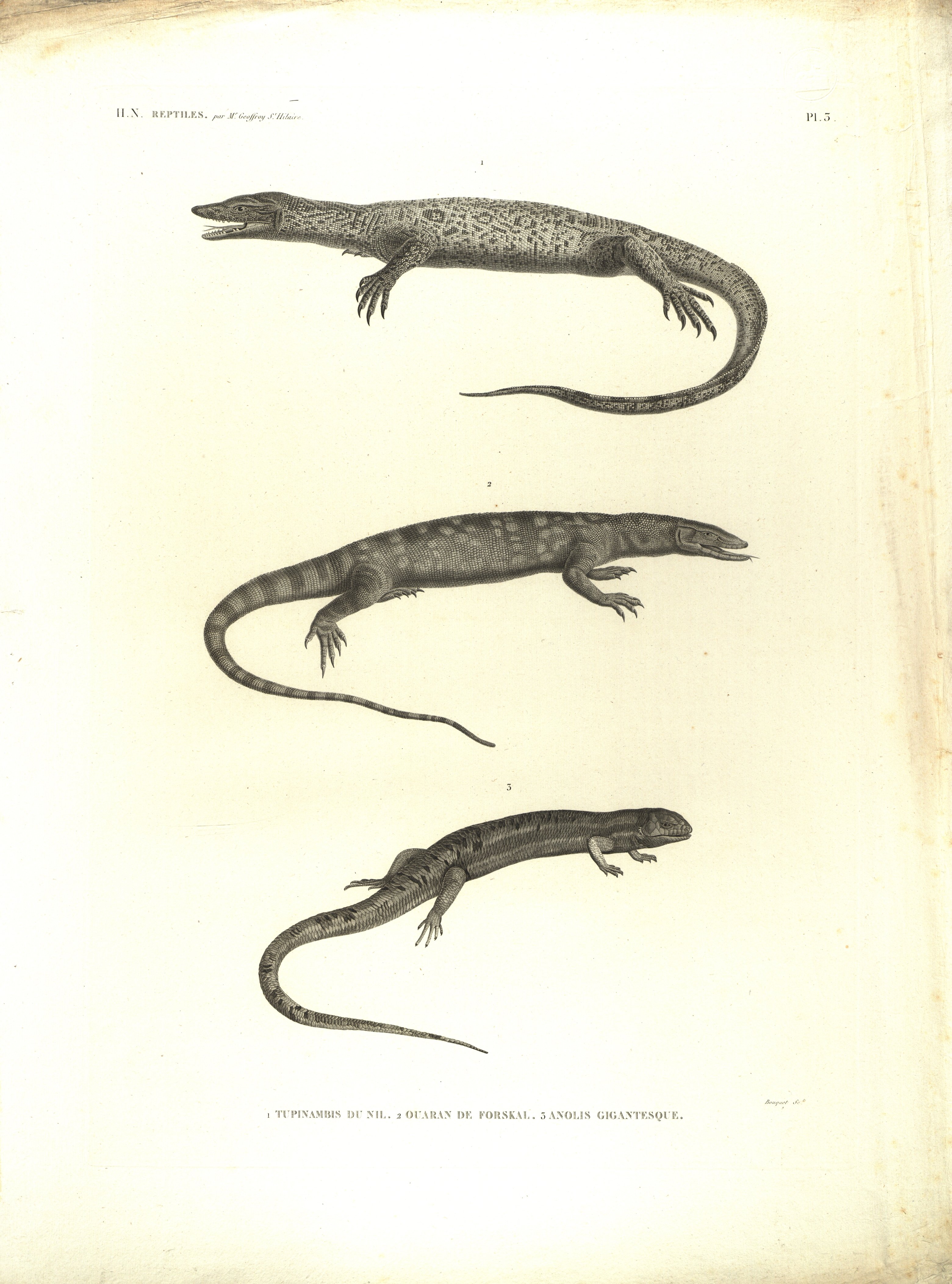 Saturs: 1. Tupinambis du Nil -- 2. Ouaran de forskal -- 3. Anolis gigantesque. Gravīra, veržē papīrs, apmierinošs stāvoklis, lapas labajā augšējā stūrī izdevuma aklā spieduma zīmogs.