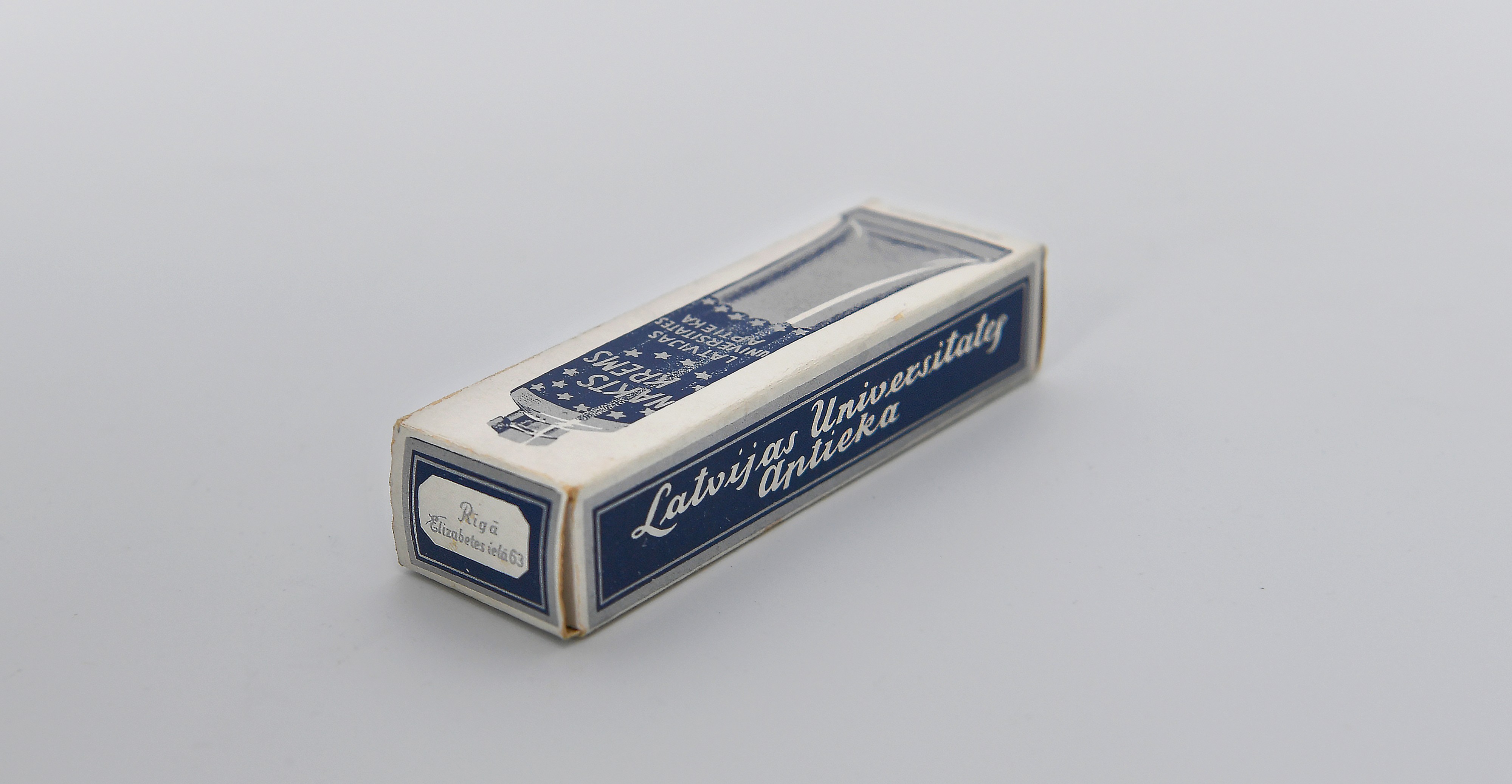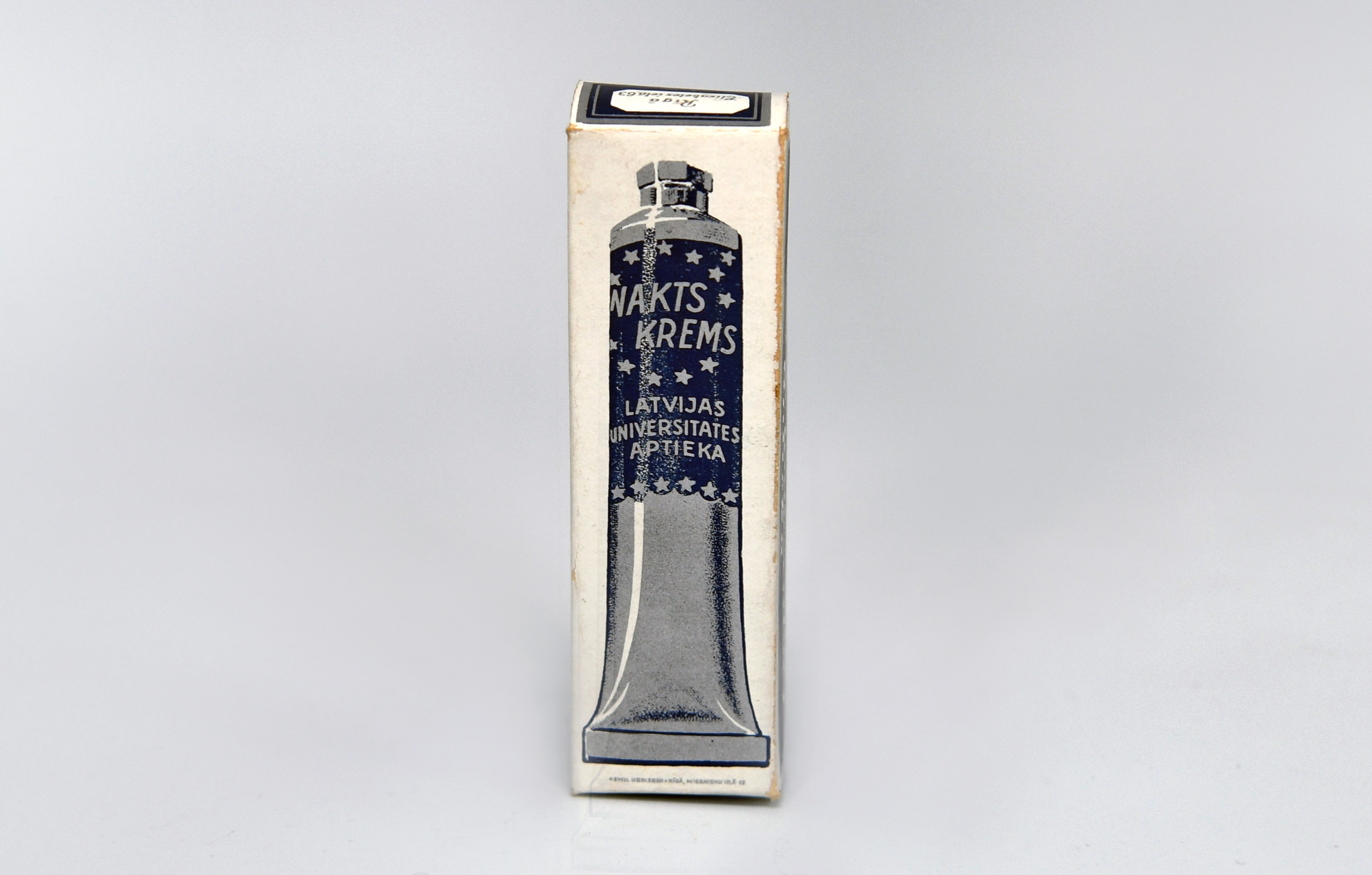 The packaging of a cosmetic product, night cream, made by the University of Latvia (UL) pharmacy. The UL pharmacy was opened in 1923 at Elizabetes Street 63, Riga, as an internship place for students of the Pharmacy Department of the Faculty of Chemistry. It existed until 1944. The packaging of the night cream is stored in the UL Museum's UL History collections. Packaging dimensions - 11 x 3 x 2cm. Photograph dimensions - 3122 x 1993px (vertical) and 3999 x 2075px (horizontal).