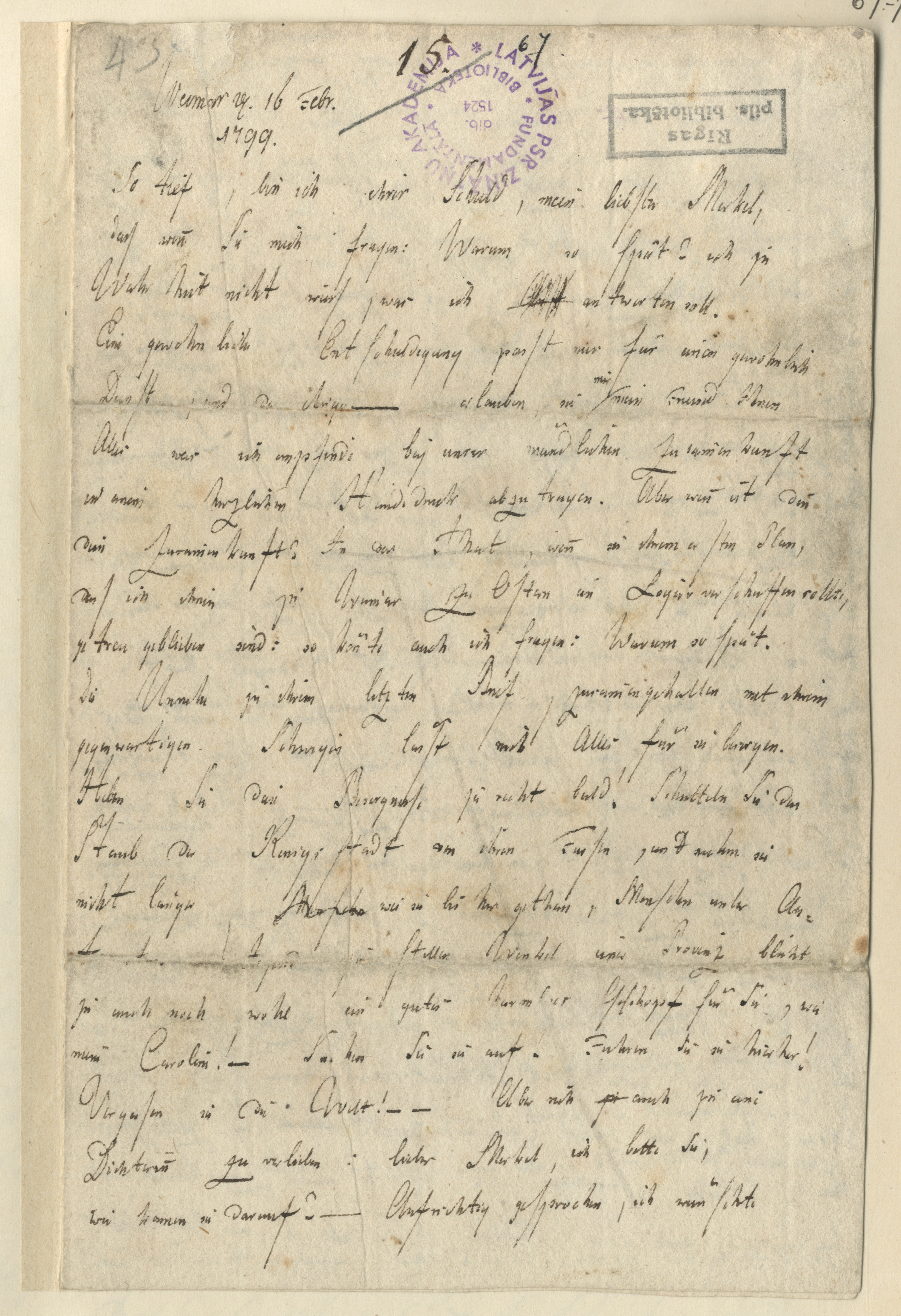 Falk Johannes Daniel. Brief an Garlieb H. Merkel. - Weimar, d[en] 16. Febr[uar] 1799. - 4 S. - Ms. 930a, Nr. 15, Bl. 39r-40v