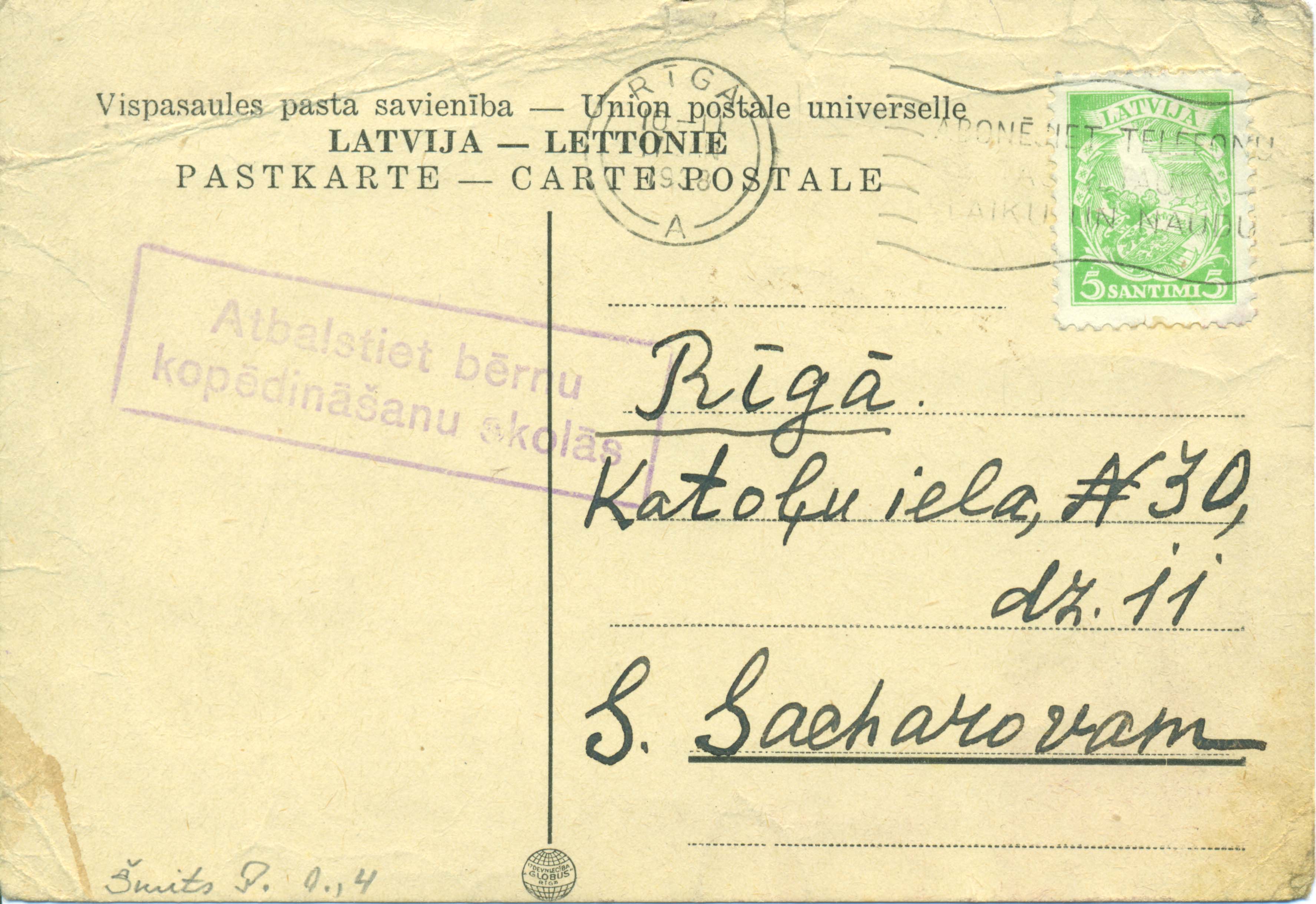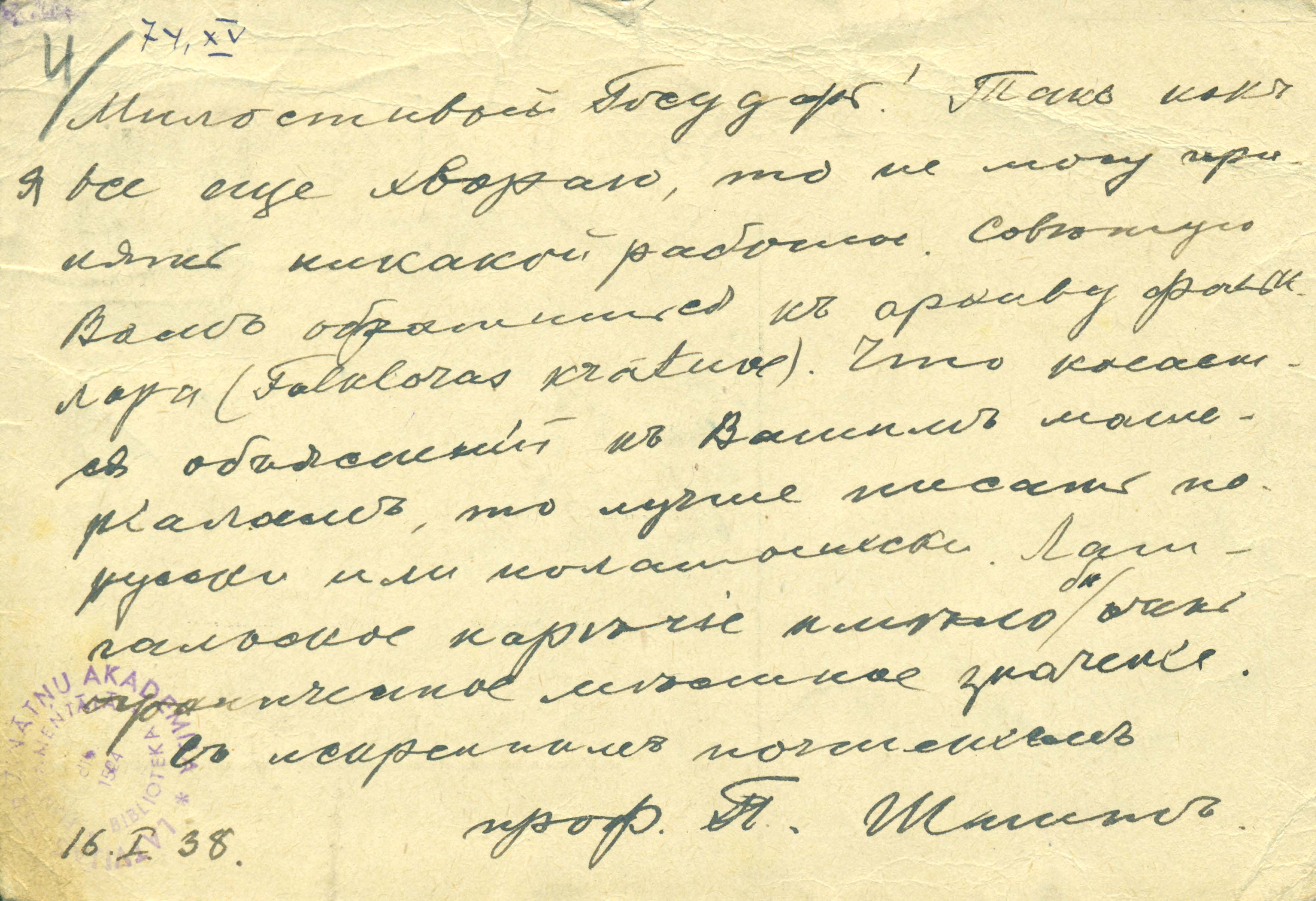 Pētera Šmita vēstule baltkrievu sabiedriskajam darbiniekam, publicistam, etnogrāfam, folkloristam un pedagogam Sergejam Saharovam. Rīga, 1938, 1 lp.