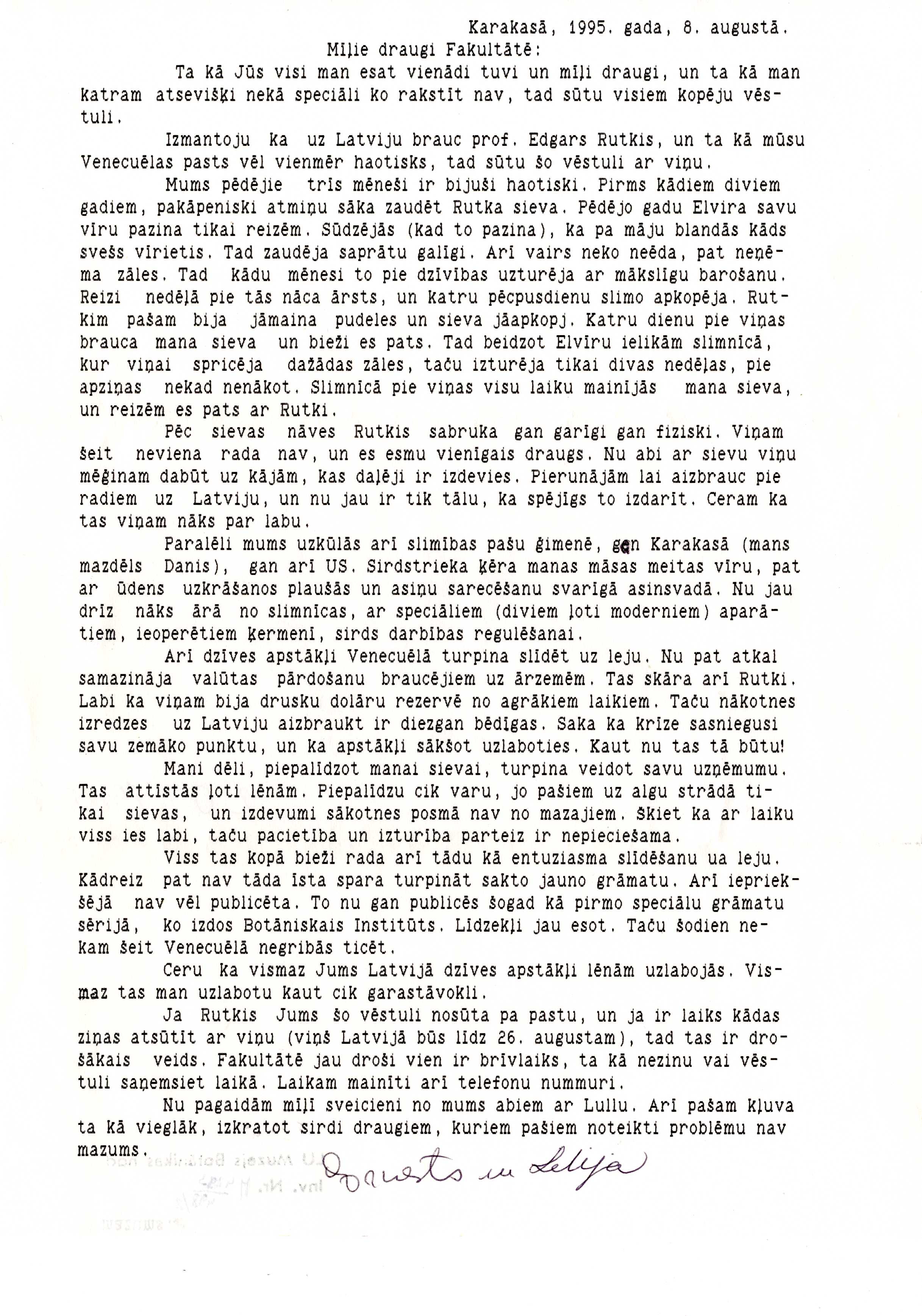 Ernesto Foldat's letter to friends at the Faculty of Biology of the University of Latvia, in which he writes about the illness and death of the wife of the professor Edgars Rutkis, the health of Foldat family members, the difficult economic situation in Venezuela, his sons' difficulties in running the business and publishing his books. Wishes and signature at the end. Copy of a typewritten letter on one page. Stored in the Museum of the University of Latvia Botanical and Mycological collections