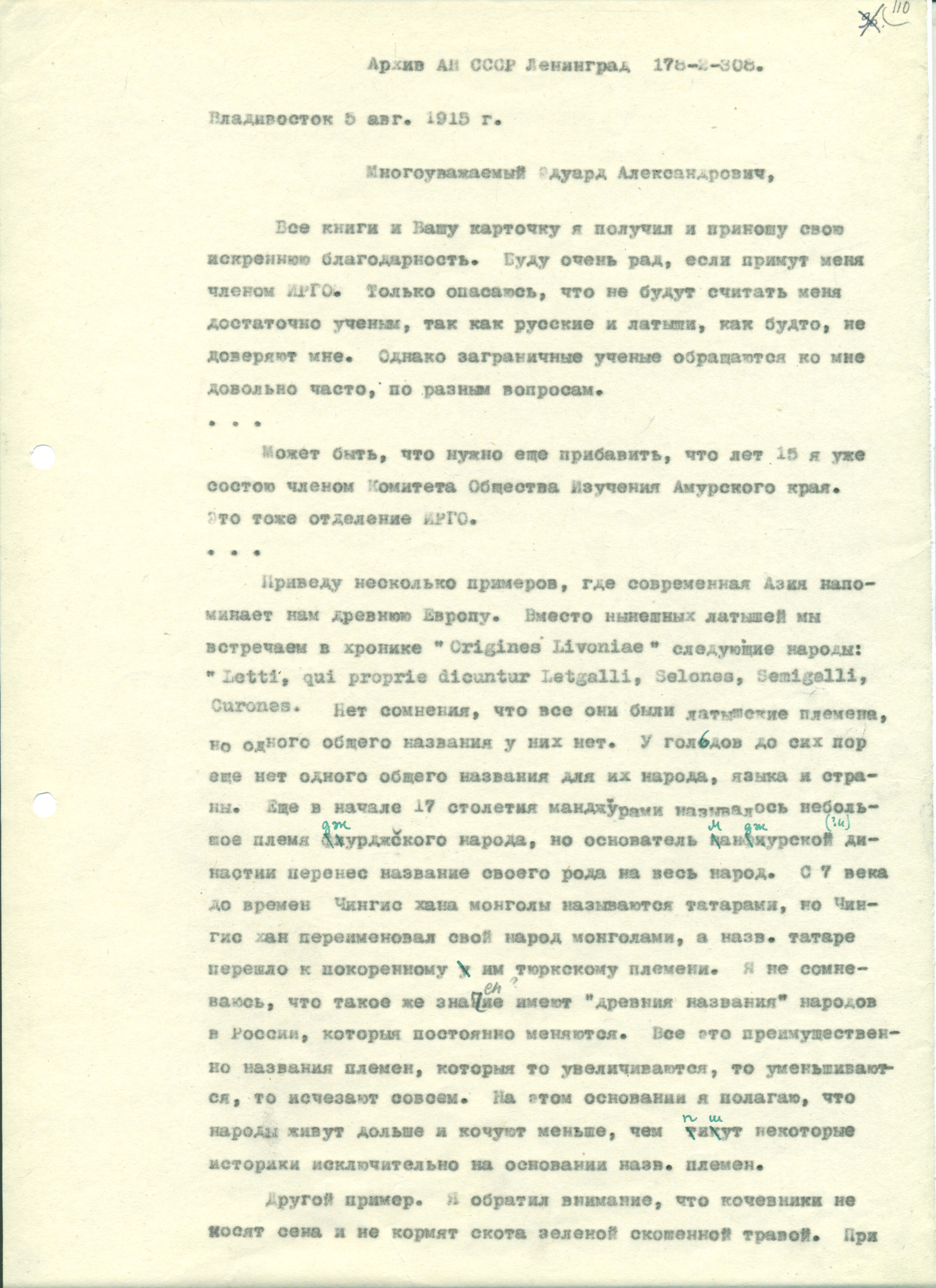 Pētera Šmita vēstule Eduardam Volteram. Vladivostoka, 1915. 3 lp.