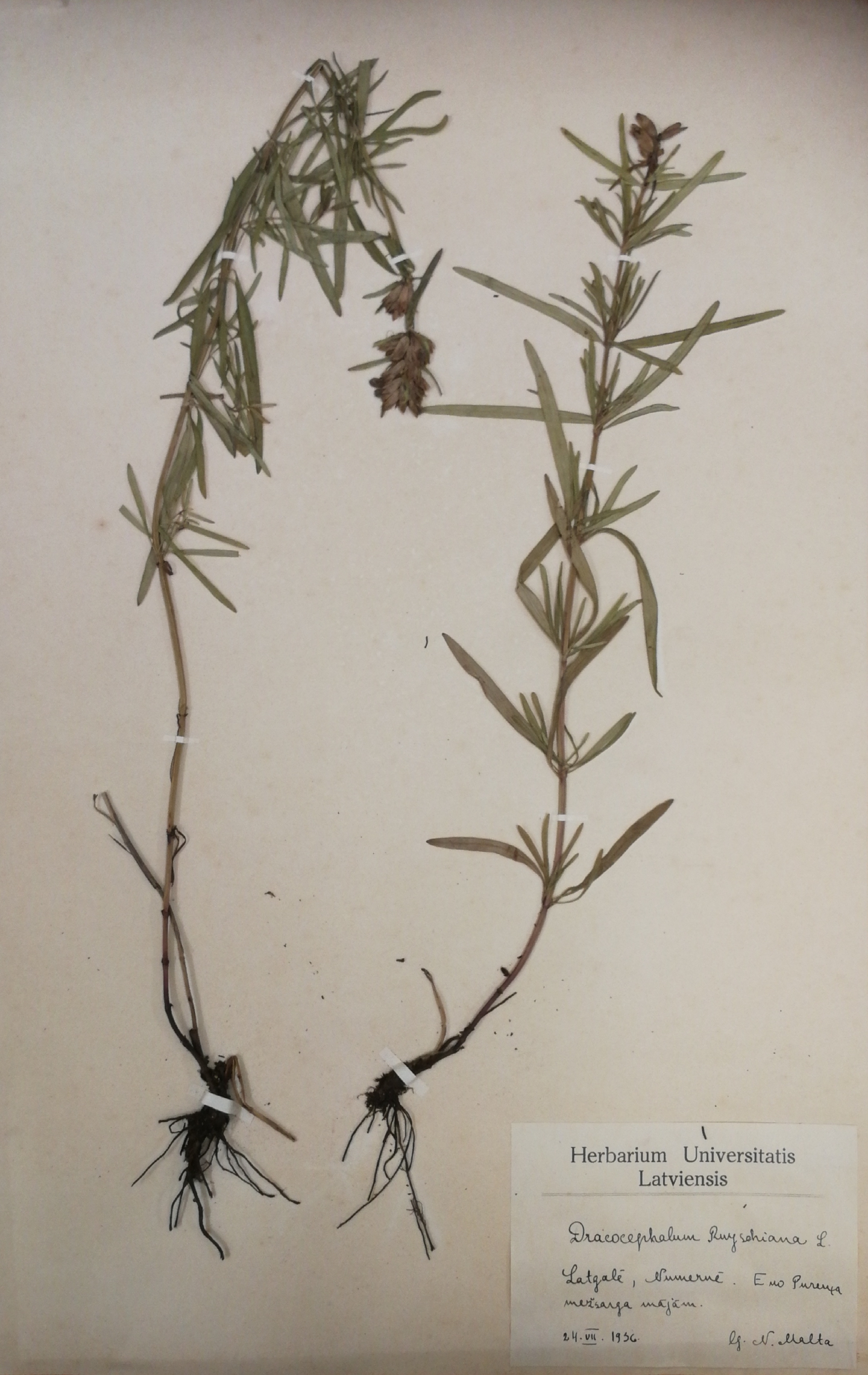 Ruiša pūķgalve; Atradne: Latgalē, Numernē, austrumos no Puriņu mežsarga mājām. /// Northern Dragon-head, deposit: In Latgale, Numerne, east of the Purin forest rangers home. [Attēls no LU Muzeja kolekcijas Herbarium Latvicum (RIG II); (BOT1029_13)]
