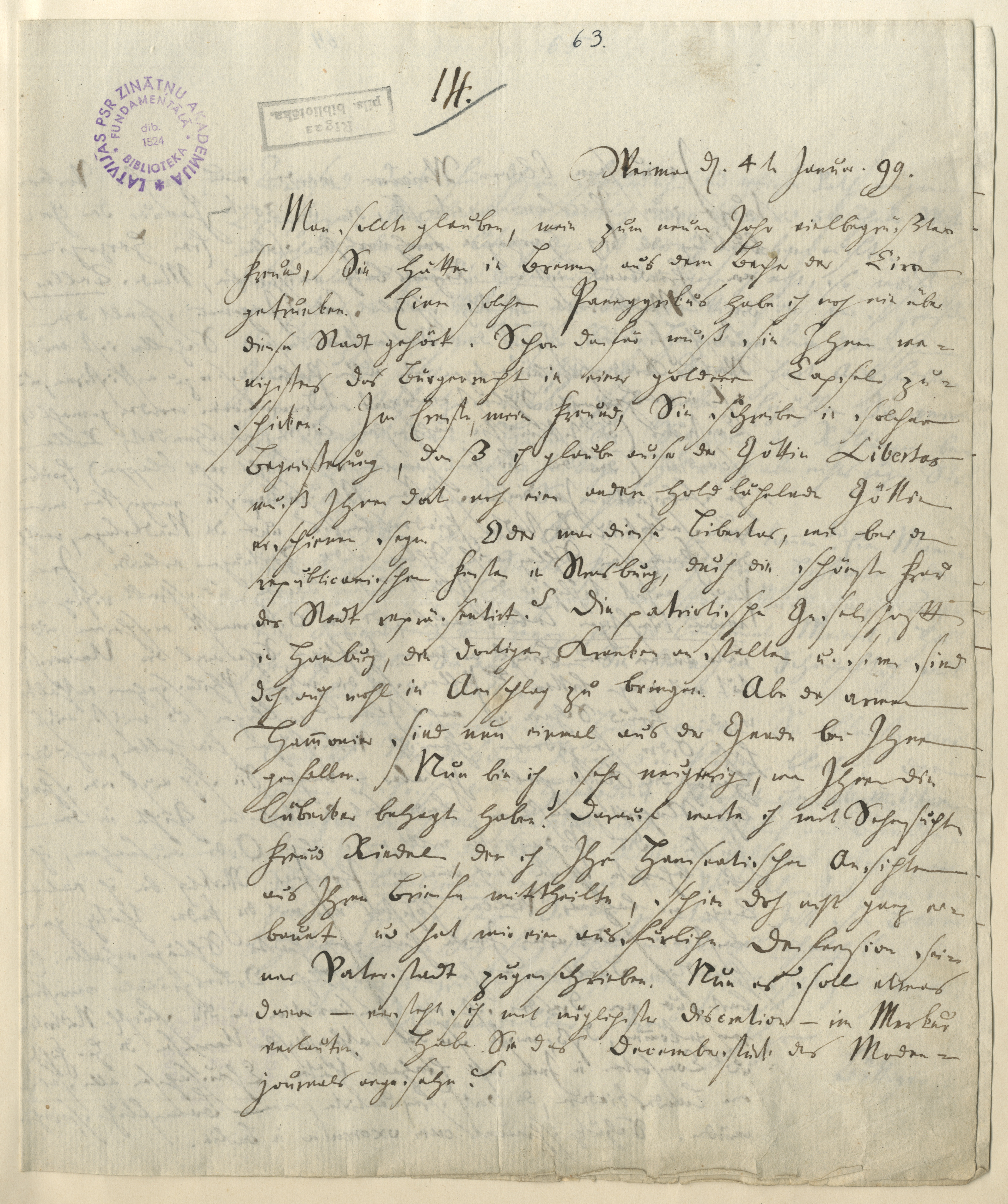 Research Subject Categories::HUMANITIES and RELIGION, Apgaismības laikmets, Aufklärung, Literatur, literatūra, Merkel Garlieb Helvig (1769-1850), Merķelis Garlībs Helvigs (1769-1850), Panegyrikus [lit. Lobesdichtung], slavas dziedājumi, Göttin Libertas [hier: städtische Freiheit], Brīvības dieviete [šeit: pilsētas brīvīva], Patriotische Gesellschaft von 1765, patriotiskā sabiedrība 1765, Hamburger Krankenanstalt [Allgemeine Armenanstalt?], Hamburgas dziednīca, „Der neue teutsche Merkur“, „Hamburger Damen-, Kunst- und Modejournal“, „Piccolini“ [Teil von Schillers „Wallenstein“], Schauspiel, luga, Rastatter Friedensbasis [Verhandlungsbasis auf dem Rastatter Kongress 1797-1799], Raštates kongress 1797-1799, Podagristen [Gichtleidende], podagras slimnieki, Duellmord, nāve duelī, Studentenorden, studentu ordenis, Hochzeit, kāzas, Böttiger, Karl August (1760-1835), Ridel, Cornelius Johann Rudolf (1759-1821), Großherzogin Luise von Sachsen-Weimar-Eisenach (1757-1830), Jagemann von Heygersdorff, Karoline (1777-1848), Graff, Johann Jakob (1768-1848), Iffland, August Wilhelm (1759-1814), Prinz Bernhard von Sachsen-Weimar-Eisenach (1792-1862), Großherzog Karl Friedrich zu Sachsen-Weimar-Eisenach (1783-1853), Jean Paul (Richter, Johann Paul Friedrich, 1763-1825), Scherer, Alexander Nicolaus (1771-1824), Großherzog Karl August zu Sachsen-Weimar-Eisenach (1757-1828), Sander, Johann Daniel (1759-1825), Schröder, Friedrich Ludwig (1744-1816), Bucholtz, Wilhelm (1734-1798), Reimarus, Johann Albert Heinrich (1729-1814), Bürger Reinhard [Reinhard, Karl Friedrich Graf von (1761-1837), Herder, Carolina Maria (1750-1809), Herder, Johann Gottfried (1744-1803), Herders Johans Gotfrīds (1744-1803), Böttiger, Eleonor