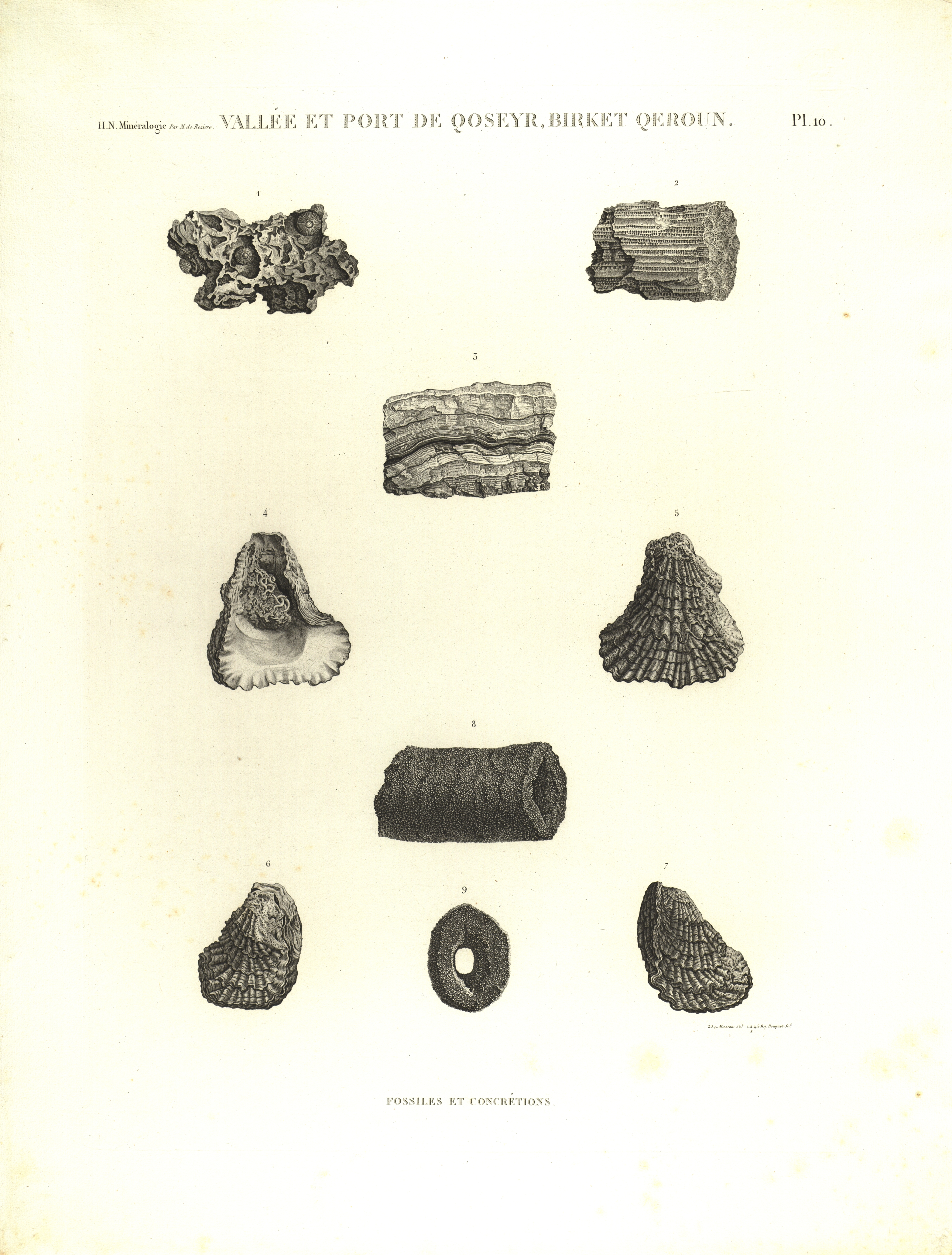 Description de l'Égypte, ou, Recueil des observations et des recherches qui ont été faites en Égypte pendant l'expédition de l'armée française. Vallée et port de Qoseyr, Birket Qeroun : fossiles et concrétions : [gravīra] / par M. de Roziere, [3., 8., 9. zīm. gravētājs] Masson, [1., 2., 4., 6., 7. zīm. gravētājs] Bouquet. 2. izd. [Paris] : C.L.F. Panckouke, 1826. 1 lp. (m/b) ; plate 43x59 cm, lp. izmērs 54x71 cm. Histoire naturelle. Minéralogie ; pl. 10