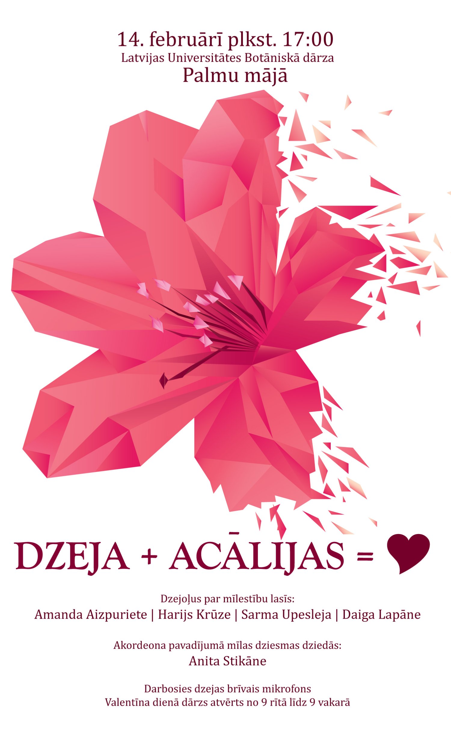 "Dzeja + acālijas=" : afiša Latvijas Universitātes Botāniskā dārza pasākumam 2013. gada 14. februārī