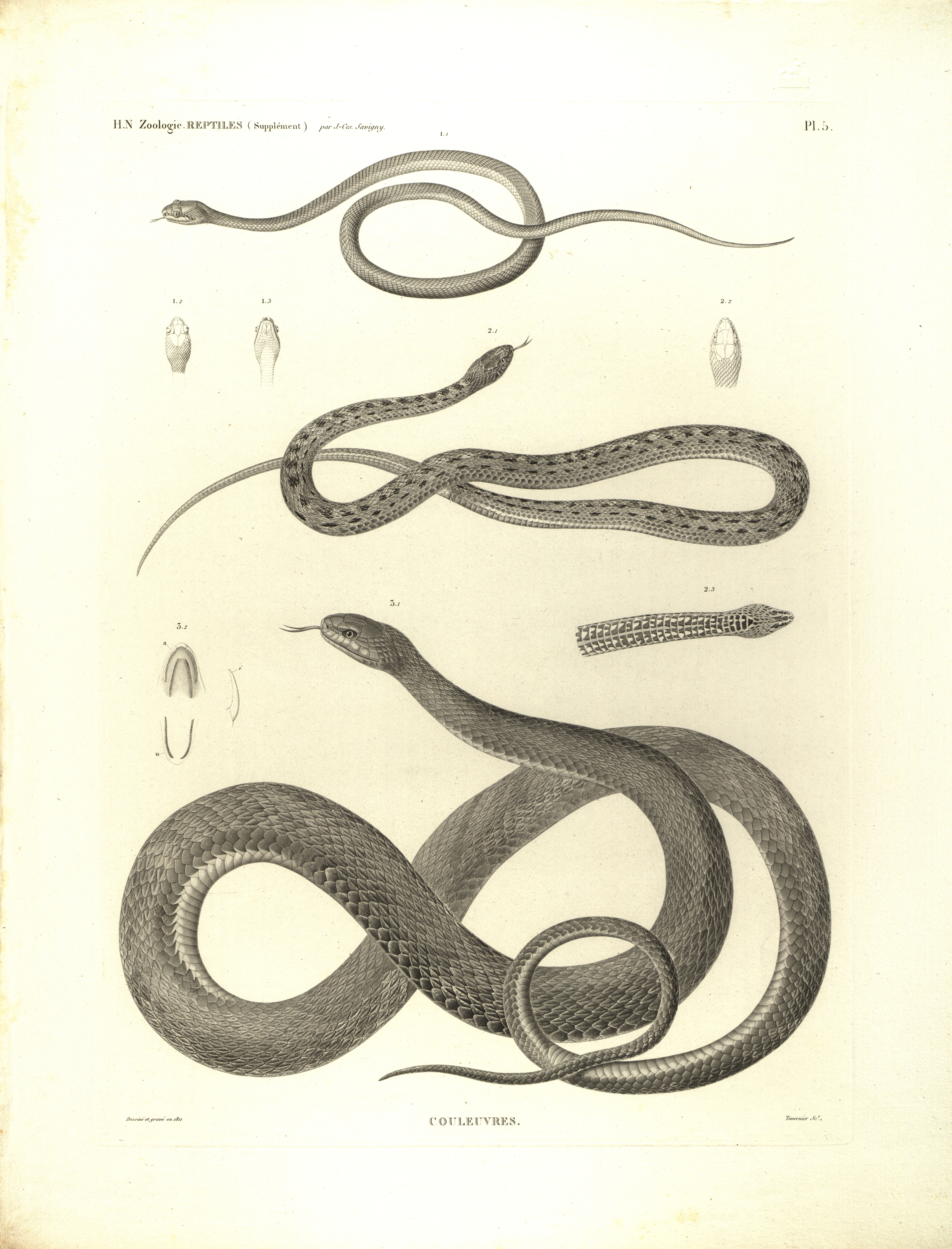 Description de l'Égypte, ou, Recueil des observations et des recherches qui ont été faites en Égypte pendant l'expédition de l'armée française. Reptiles : (supplément) : Couleuvres : [gravīra] / [gravīras zīm. autors] J.-C. Savigny, [gravētājs] Tavernier. 2. izd. [Paris] : C.L.F. Panckouke, 1826. 1 lp. (m/b) ; plate 59x42 cm, lp. izmērs 71,5x55 cm. Histoire naturelle. Zoologie. Reptiles (supplément) ; vol. 1, pl. 5