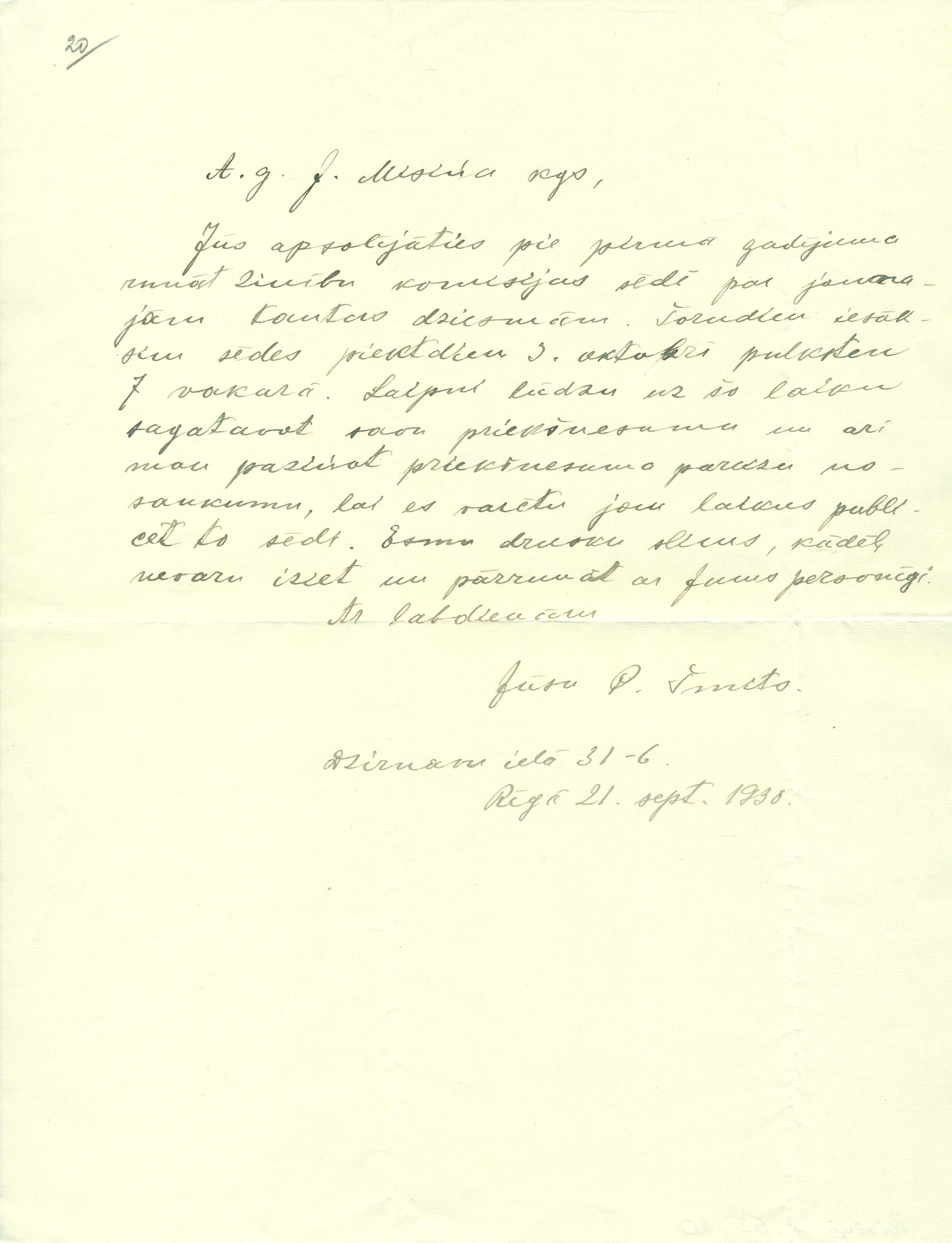 P. Šmita vēstule J. Misiņam. Rīga, 1930. 1 lp.