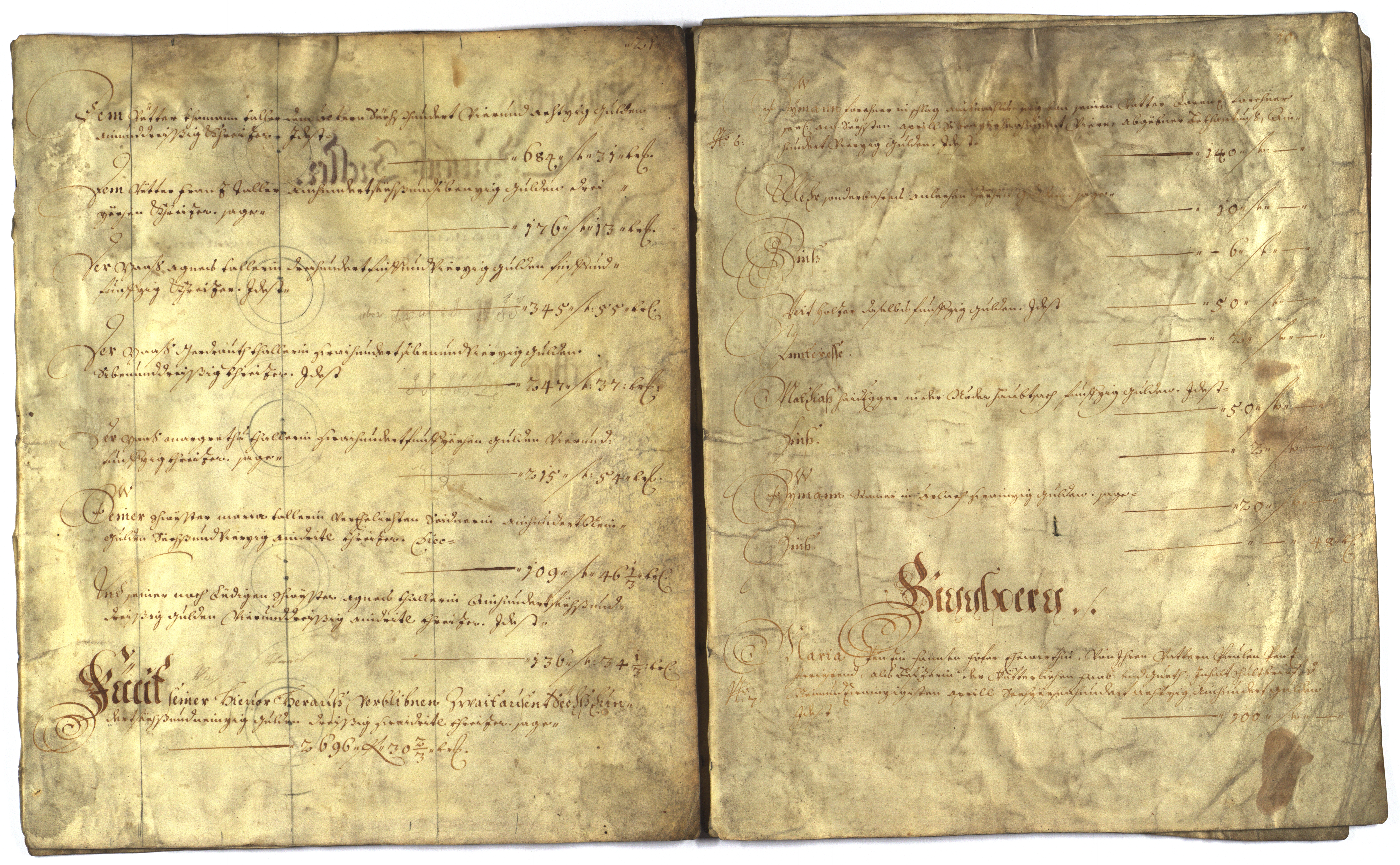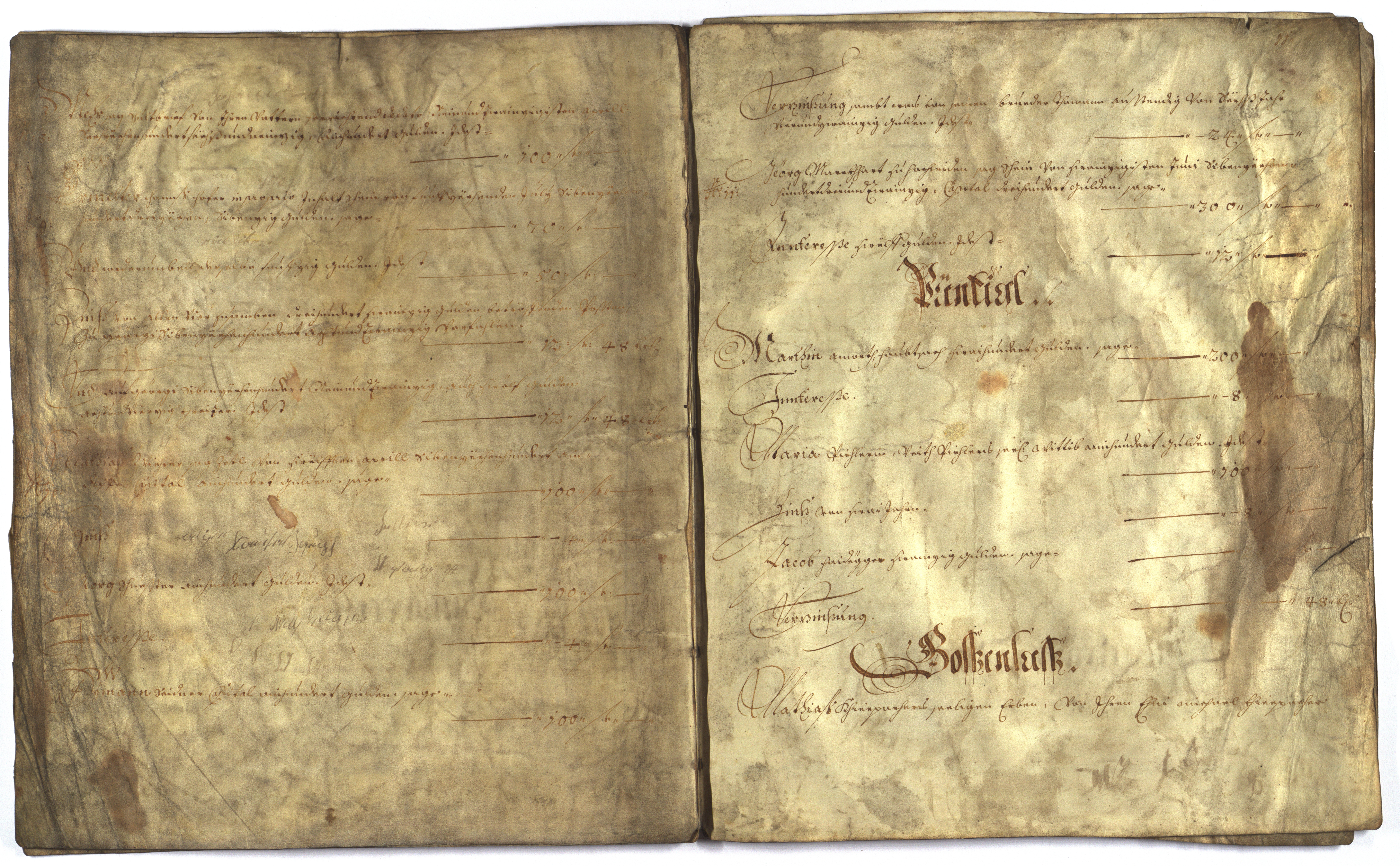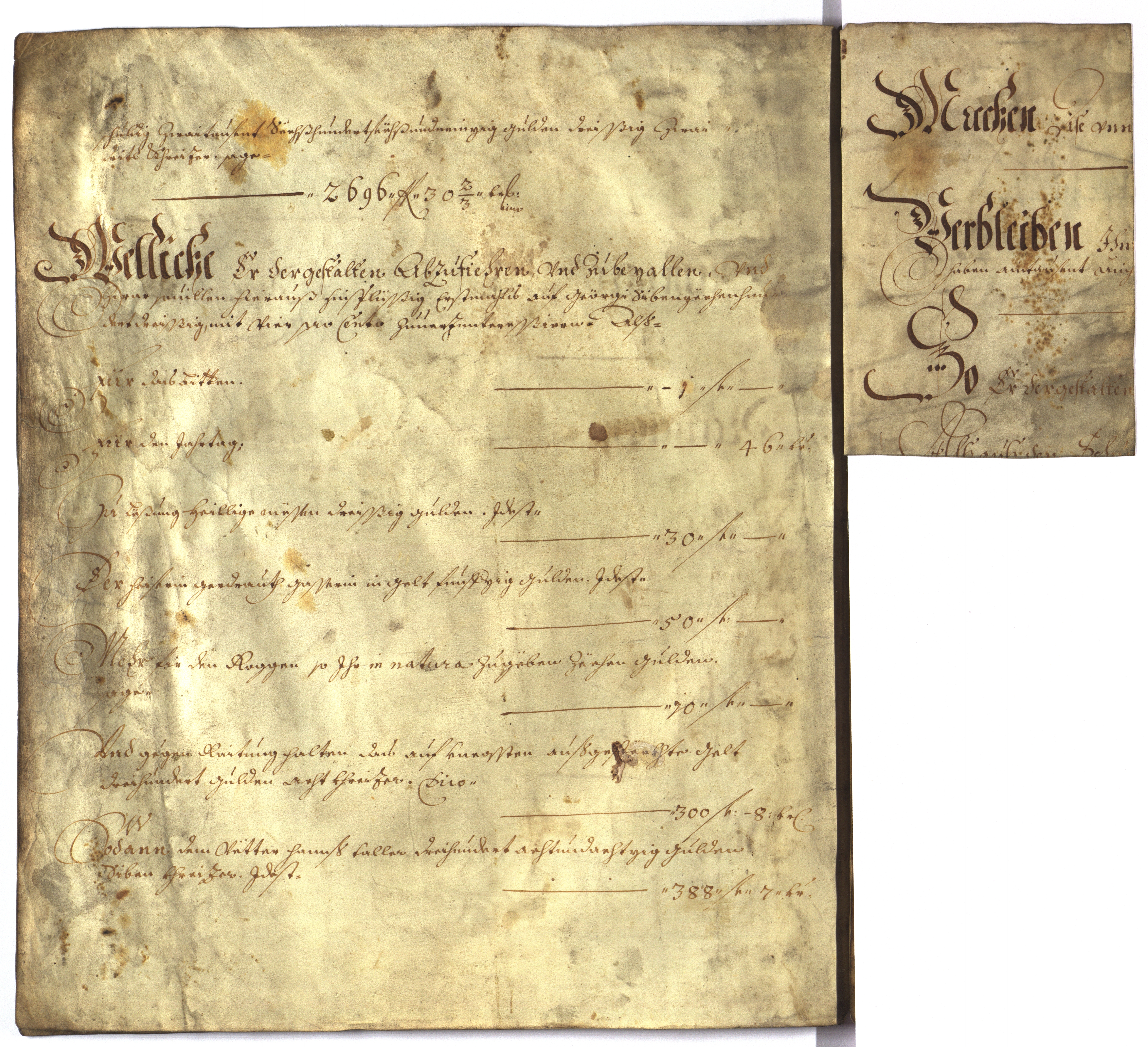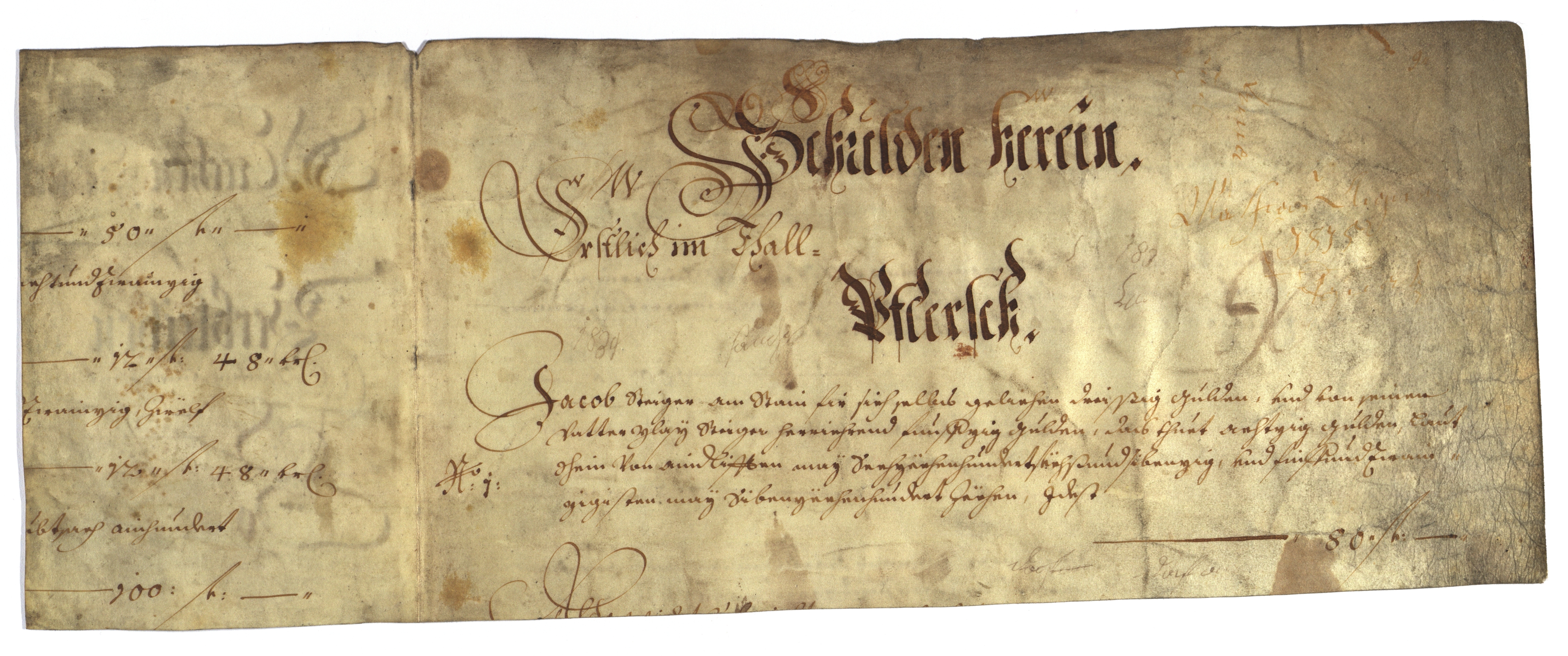 [Parādu grāmata] [rokraksts] : [pergaments : teksta fragments]. Vācija, [16.-17. gs.]. 8 lp. (16 lpp.) : pergaments, 8 lapas 29x35 14, 1 lapa 8x39,7 cm