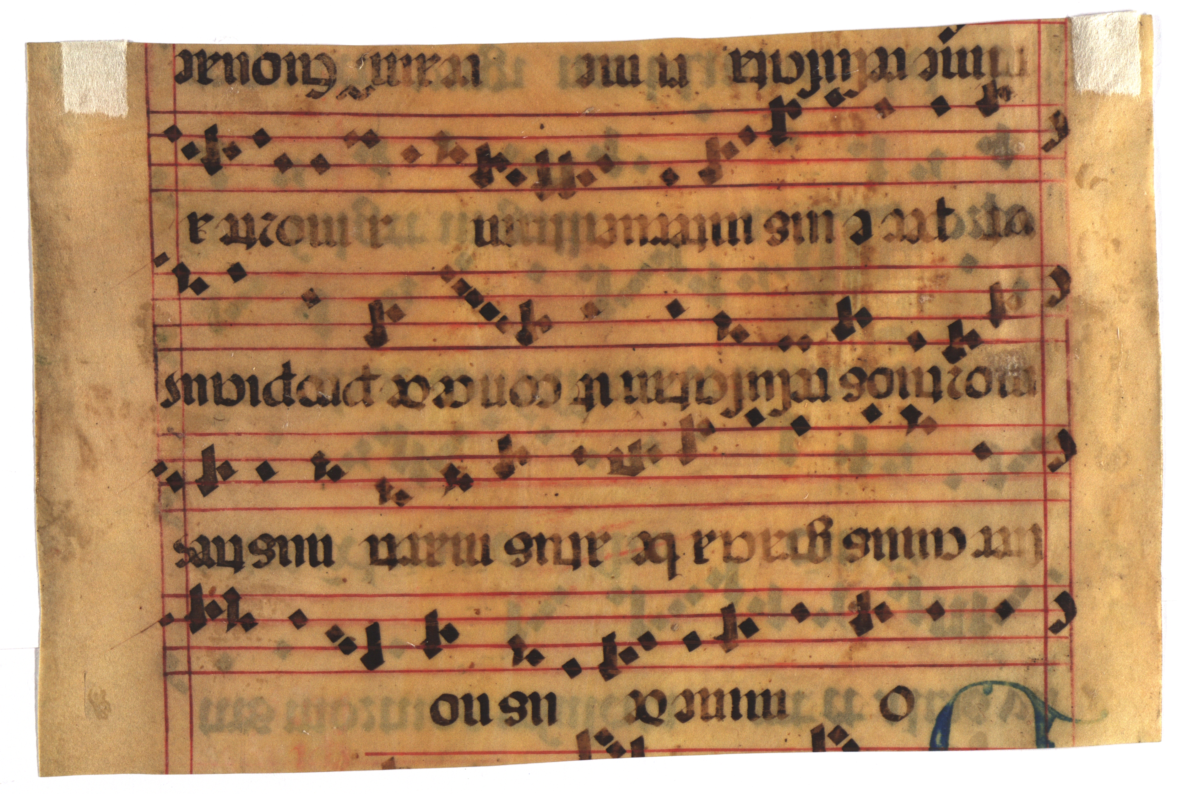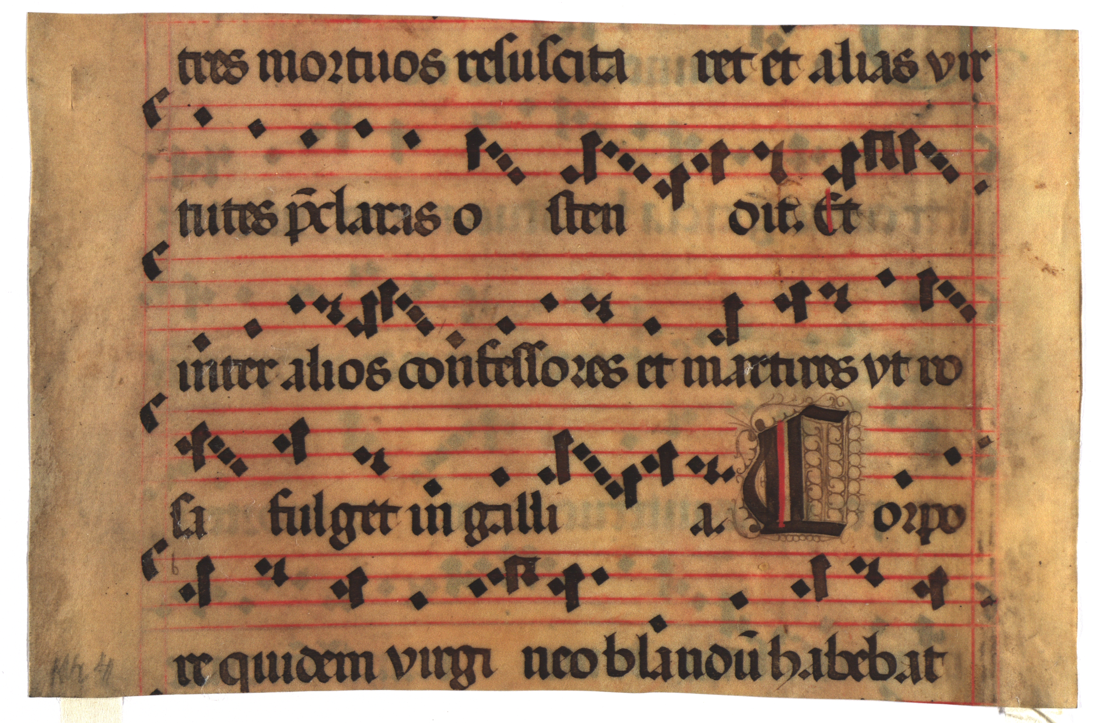 [Liturģiskā grāmata] [manuskripts] : [fragments ar Sv. Mārtiņam veltītiem dziedājumiem : pergaments]. [B. v., 14. gs.]. 1 lp. : pergaments, notis (krās.) ; 22,5x14,5 cm