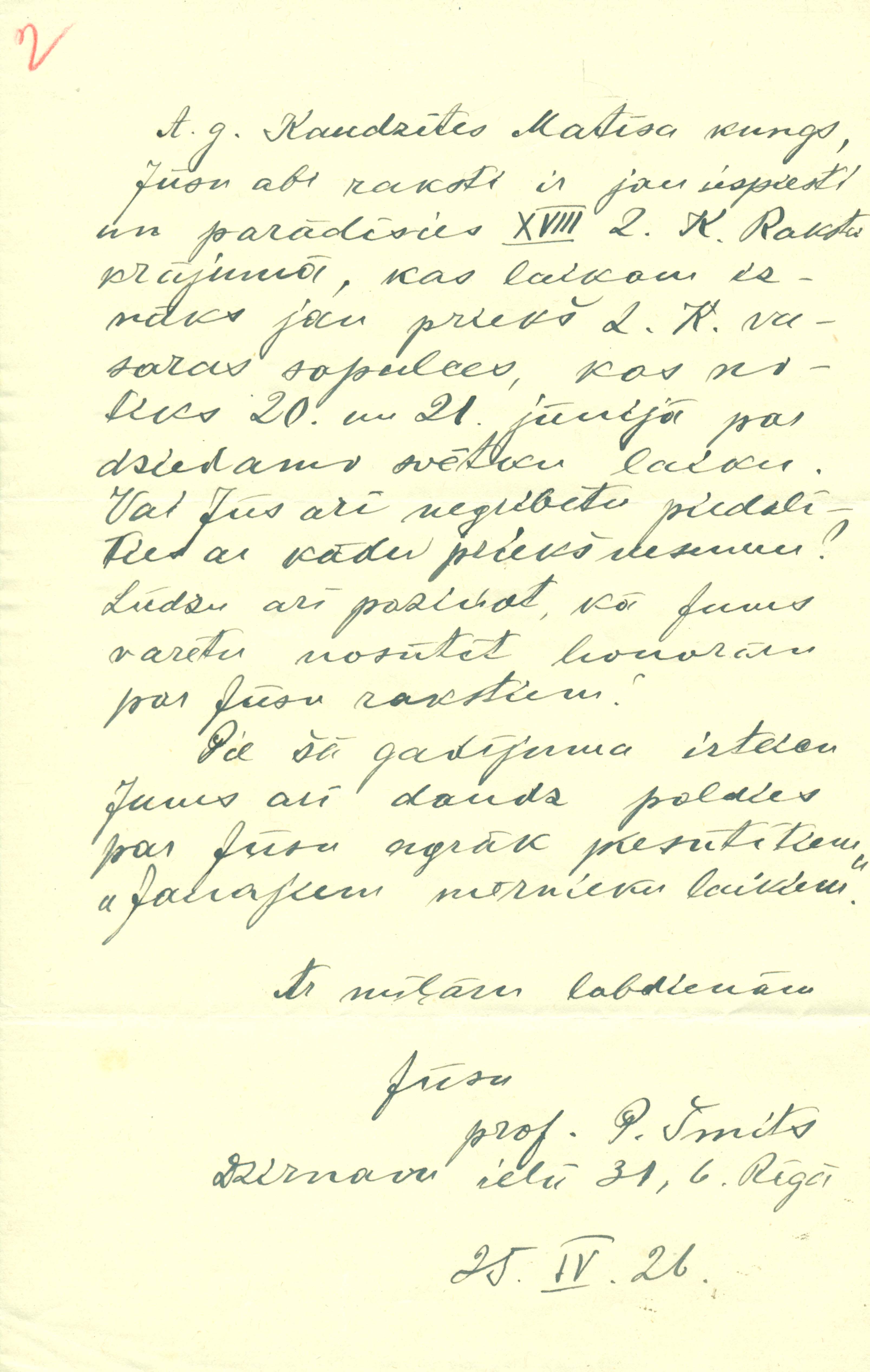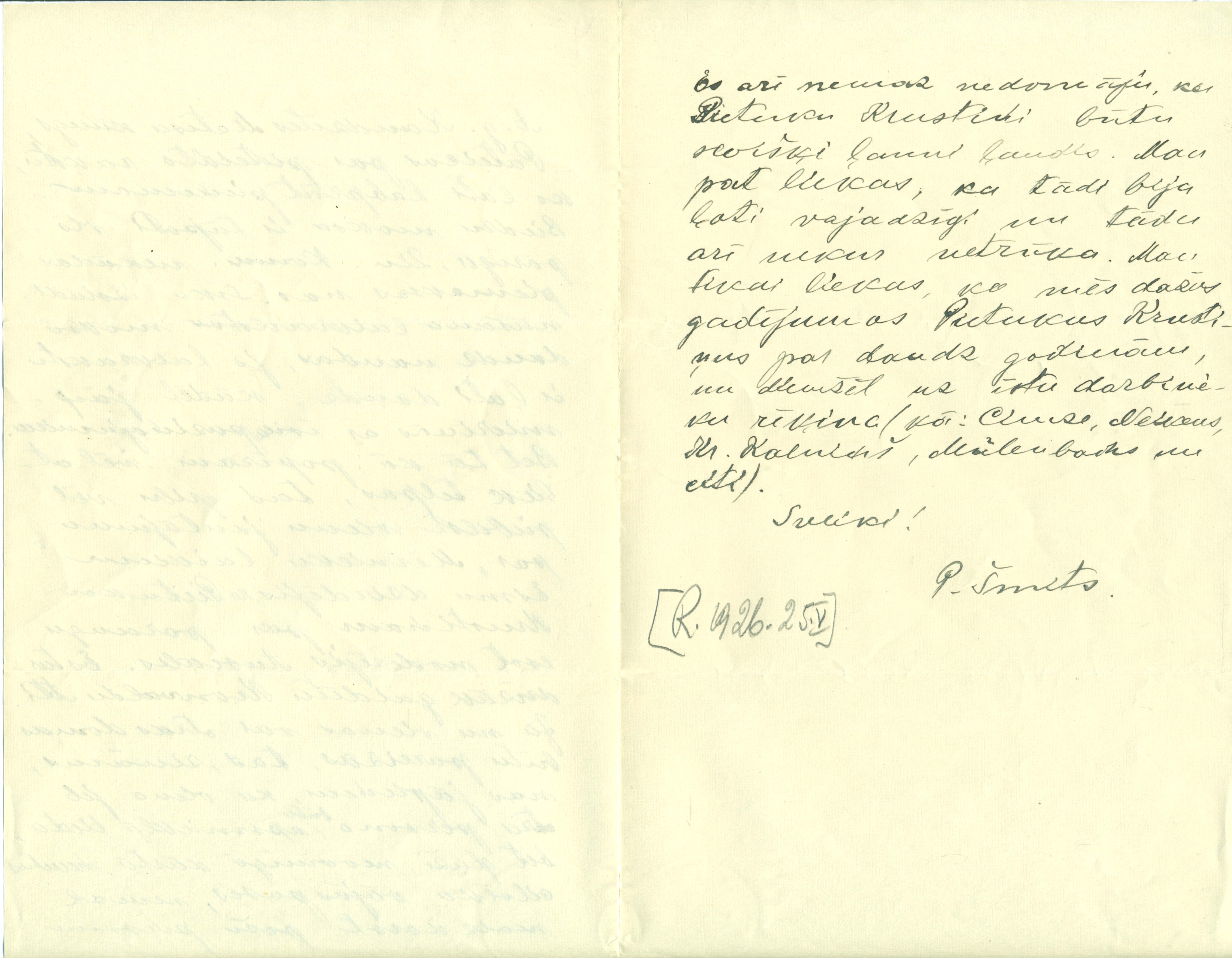 Pētera Šmita vēstules rakstniekam Matīsam Kaudzītem. Rīga, 1926 (25. apr., 6. maijā, 25. maijā, 29. jūn.) 6 lp.