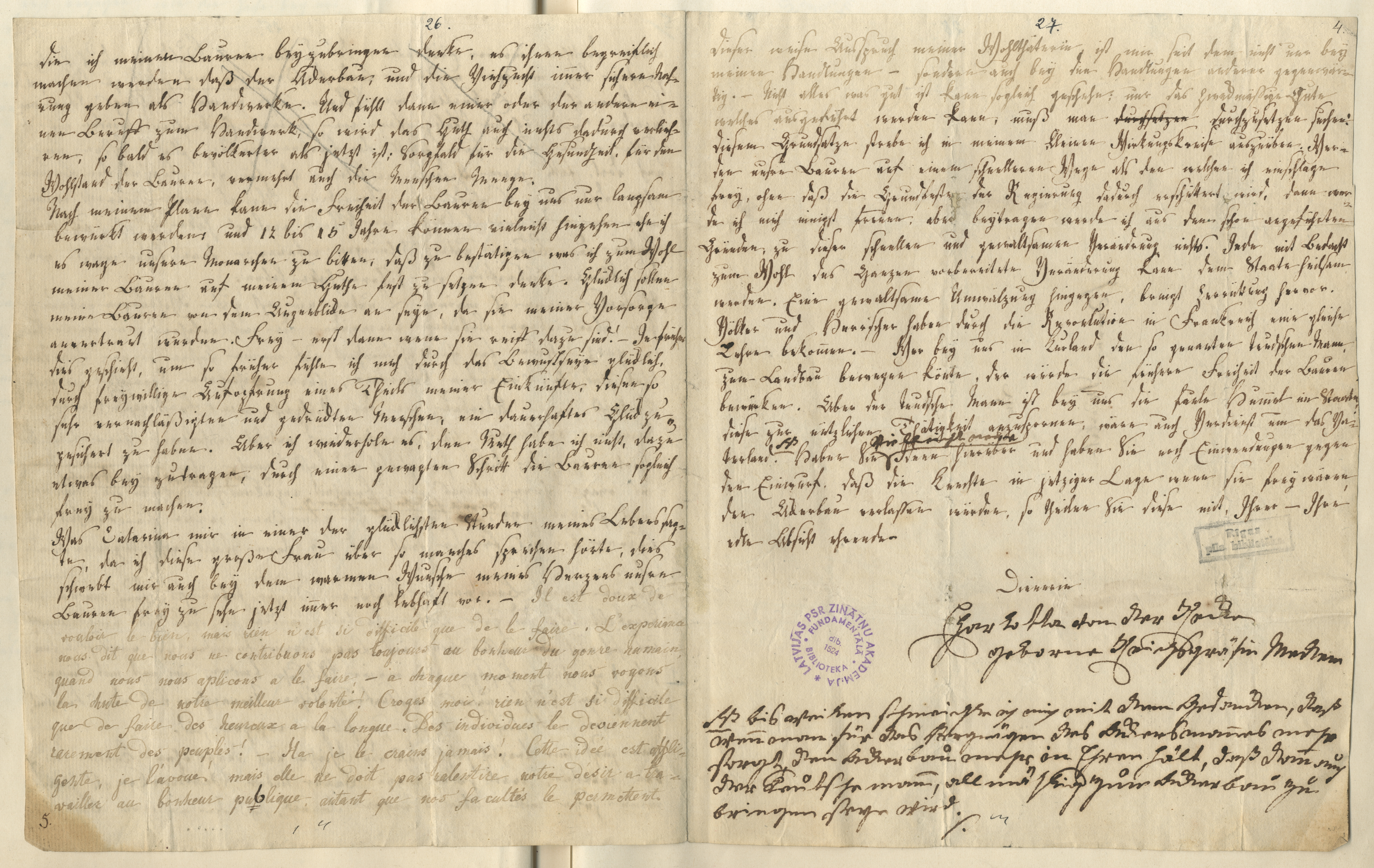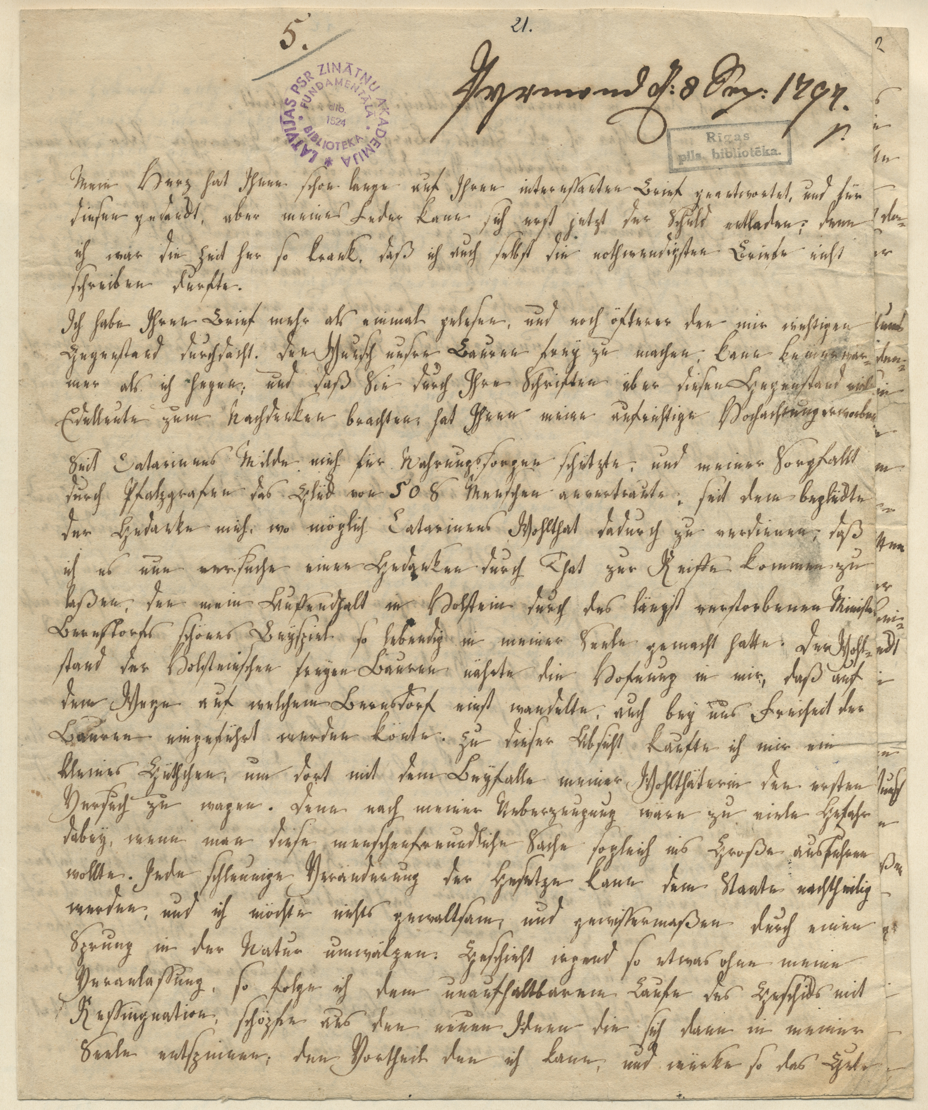 | dc.description | Ms. 930a, Nr. 5, Bl. 11r-14v Recke, Charlotte Elisabeth (Elisa) Constantia v. der. Brief an Garlieb H. Merkel, Pyrmont (?), d[en] 8. May 1797 Autora rokraksts / Autograph, vācu un franču val. / Deutsch und Französisch [8] lpp. / S. Attēlu numuri / Bildnummern: 930a-005-1 – 930a-005-8 Der Brief von Elisabeth von der Recke wurde wahrscheinlich in Pyrmont verfasst. Die Autorin bezieht sich auf einen Brief Merkels, auf den sie antwortet. Sie äußert ihre grundsätzliche Zustimmung zur Idee einer Befreiung der Bauern in Liv- und Kurland und kann als Besitzerin zweier Güter, die ihr von der Kaiserin Katharina II. übereignet wurden, als Adressatin von Merkels Forderungen, die er in „Die Letten“ formuliert, gelten, ohne, dass dieses Buch jedoch ausdrücklich genannt wird. Grundsätzlich stimmt sie mit Merkels Idee überein, dass die persönliche Freiheit ihrer Bauern für sie als Herrin bewerkstelligt werden müsse. Allerdings seien die Bauern nicht darauf vorbereitet frei zu werden, stattdessen müssten diese erst Kenntnisse in der Landwirtschaft erwerben. Als Vorbild sieht von der Recke die Befreiung der Holsteinischen Bauern durch Andreas Peter Graf von Bernstorff, die aber zum Zeitpunkt des Schreibens nach zwanzig Jahren immer noch nicht abgeschlossen sei. So taxiert sie selbst die notwendige Zeit für die Freilassung ihrer Bauern auf 12 bis 15 Jahre. Ein teilweiser Abdruck des Briefes mit Kommentaren Merkels findet sich in den 1840 veröffentlichen „Darstellungen und Charakteristiken aus meinem Leben“. Atslēgvārdi / Stichwörter Bauernbefreiung, Krongüter, Katarina II., Französische Revolution, Glückseligkeit, Mustergut Minētās personas / Erwähnten Personen Recke, Charlotte Elisabeth (Elisa) Constantia v. der (geb. v. Medem, 1754-1833), Merkel, Garlieb Helwig (1769-1850), Bernstorff, Andreas Peter Graf von (1735-1797); Katharina II. von Russland (1719-1796) Minētās vietas / Erwähnten Orte Pyrmont, Holstein, Kurland, Livland, Reval, Pfalzgraf (Kurland) Fragmentu publikācija / Teildruck Merkel, Garlieb Helwig, Darstellungen und Charakteristiken aus meinem Leben, Bd. 2, Leipzig 1840, S. 322-327 | en_US |