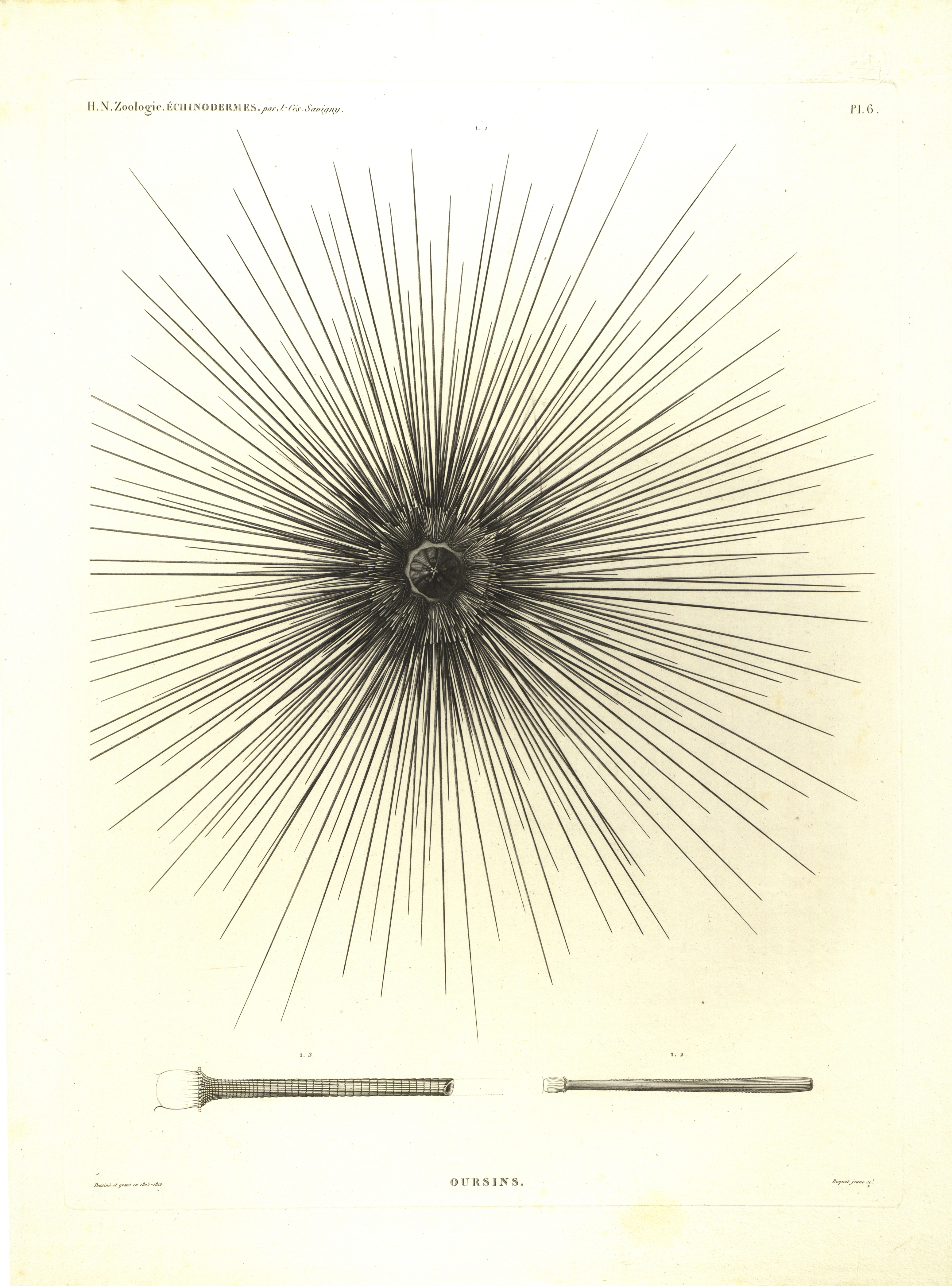 Description de l'Égypte, ou, Recueil des observations et des recherches qui ont été faites en Égypte pendant l'expédition de l'armée française. Échinodermes : Oursins : [gravīra] / [gravīras autors] J.-C. Savigny, [gravētājs] Boquet jeune. 2. izd. [Paris] : C.L.F. Panckouke, 1826. 1 lp. (1 (3) m/b zīm.) ; plate 62x46 cm, lp. izmērs 73x54,5 cm. Histoire naturelle. Zoologie. Echinodermes ; vol. 2, pl. 6