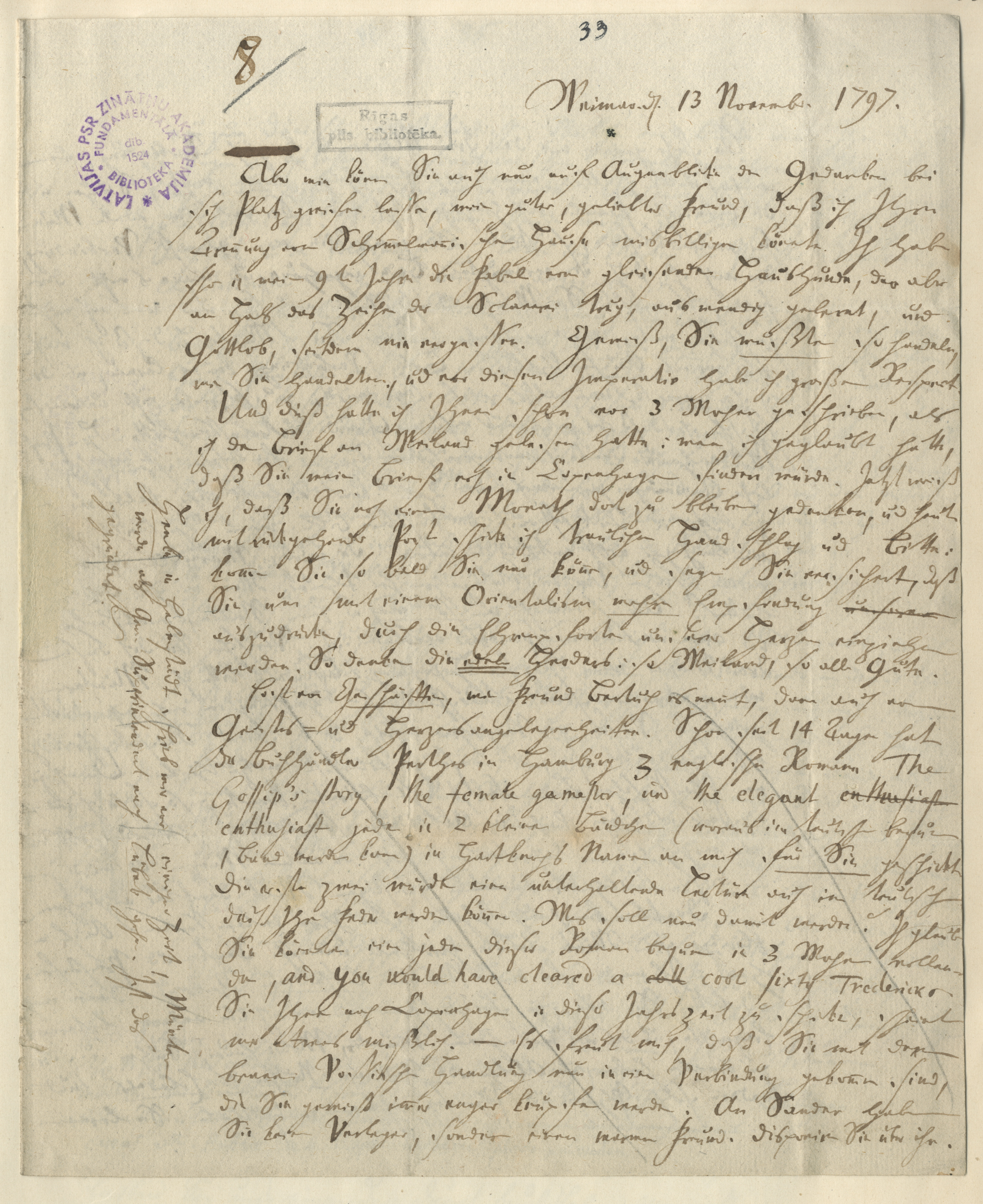 Böttiger, Karl August. Brief an Garlieb H. Merkel. - Weimar, d[en] 13. November 1797. - 4 S. - Ms. 930a, Nr. 8, Bl. 22r-23v