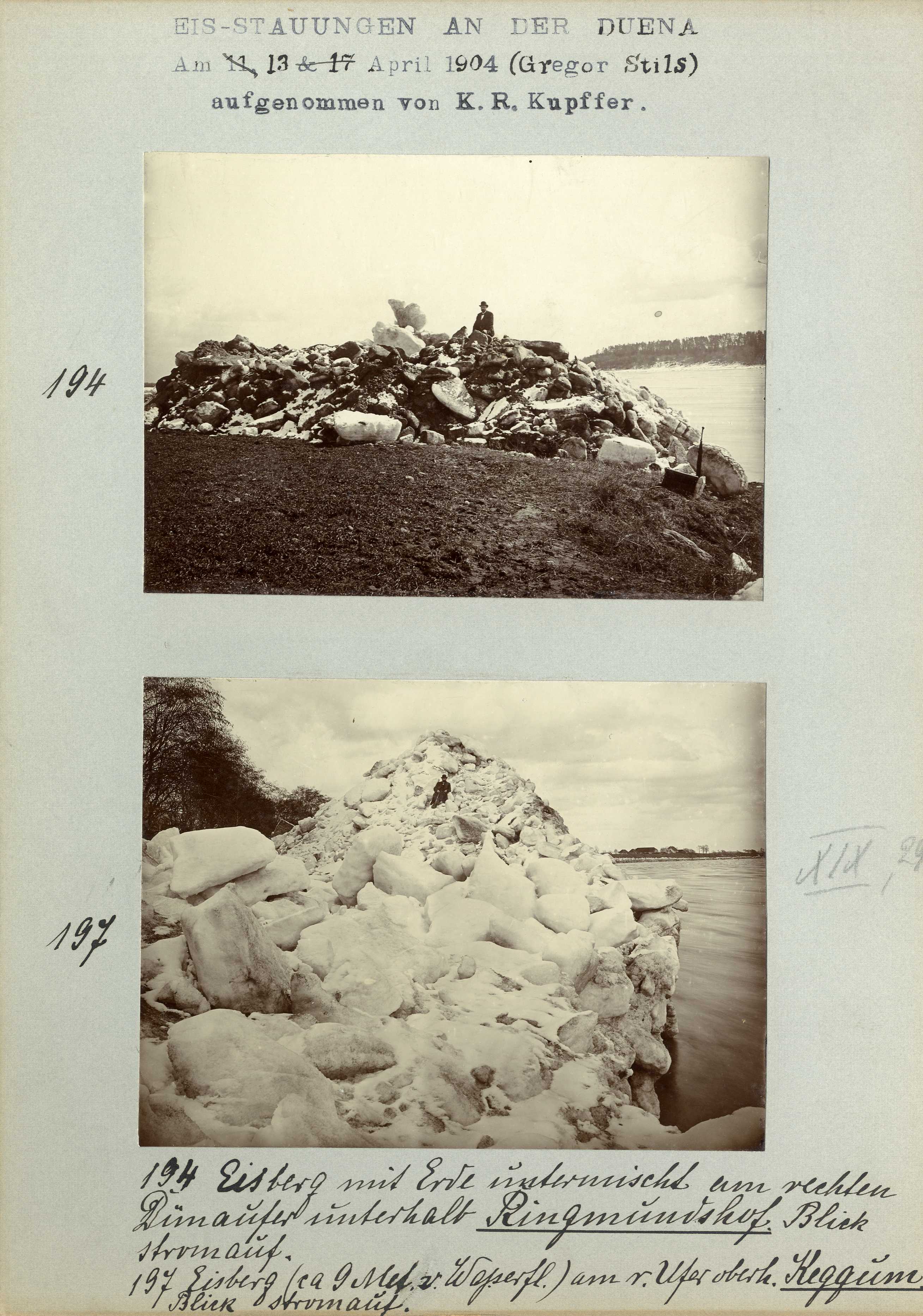 Foto 1: Eiskonglomerat-Block am v. Dünaufer unterh. Ringmundshof. Blick stromab.; Eisfeld u. Eisberge am v. Ufer unterhalb Keggum. Blick stromauf. Foto 2: Eisberg mit Erde untermischt um rechten Dünaufer unterhalb Ringmundshof. Blick stromauf.; Eisberg (ca 9 Met. v. Wasserfl.) am v. Ufer oberh. Keggum. Blich stromauf.