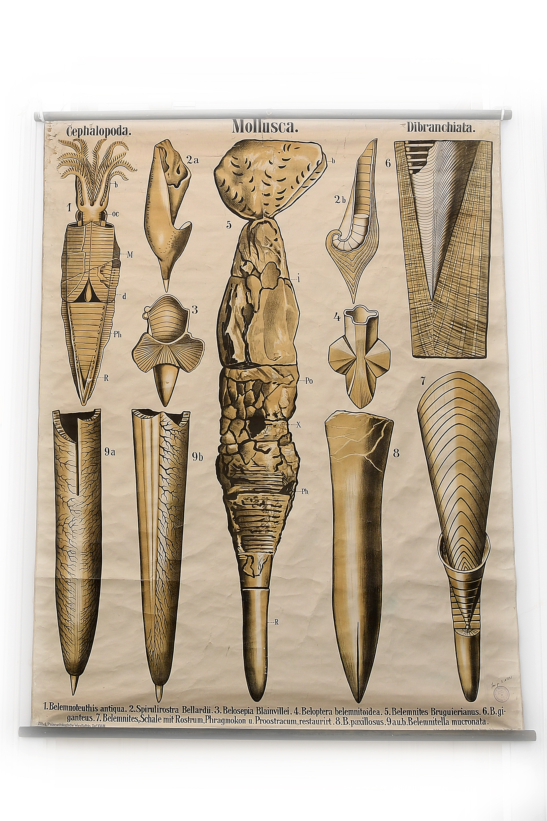 Karls Citels. Mācību plakāts paleontoloģijai - fosilo galvkāju uzbūve.