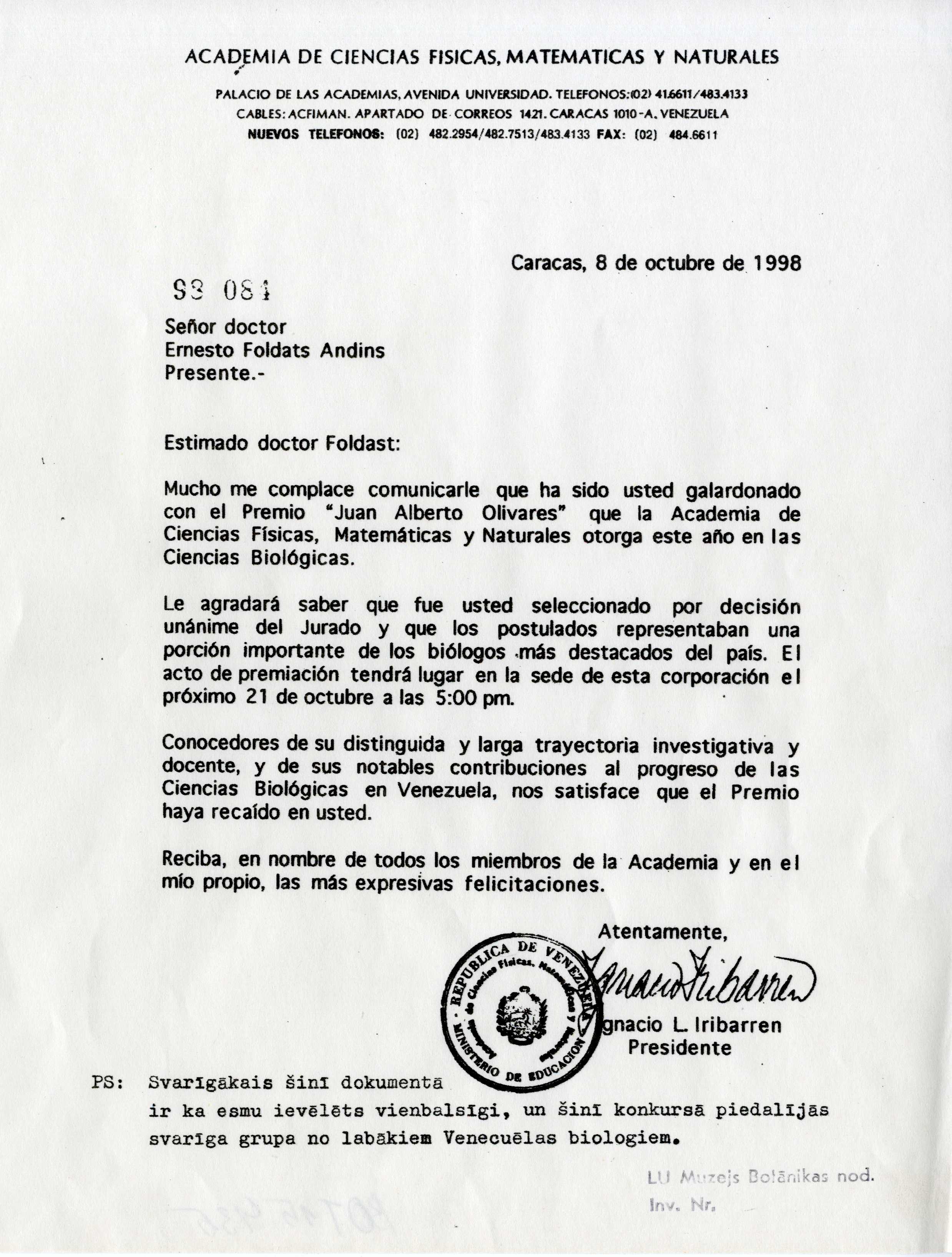 Announcement to the Latvian biologist, orchid researcher Ernesto Foldat from the Venezuelan Academy of Physics, Mathematics and Natural Sciences, that he has been awarded the Juan Alberto Olivares Prize in Biological Sciences. Ernesto Foldat was chosen by a unanimous decision of the jury and the nominees represented a significant part of the country's most prominent biologists. The announcement mentions the time and place of the award ceremony, the satisfaction with the fact of the award and the congratulations. The announcement is printed on one page with the stamp of the Academy of Physics, Mathematics and Natural Sciences and the signature of its President Ignacio L. Iribarren. Typographical inscription of Ernesto Foldat on the copy of the statement. Stored in the Museum of the University of Latvia Botanical and Mycological collections.