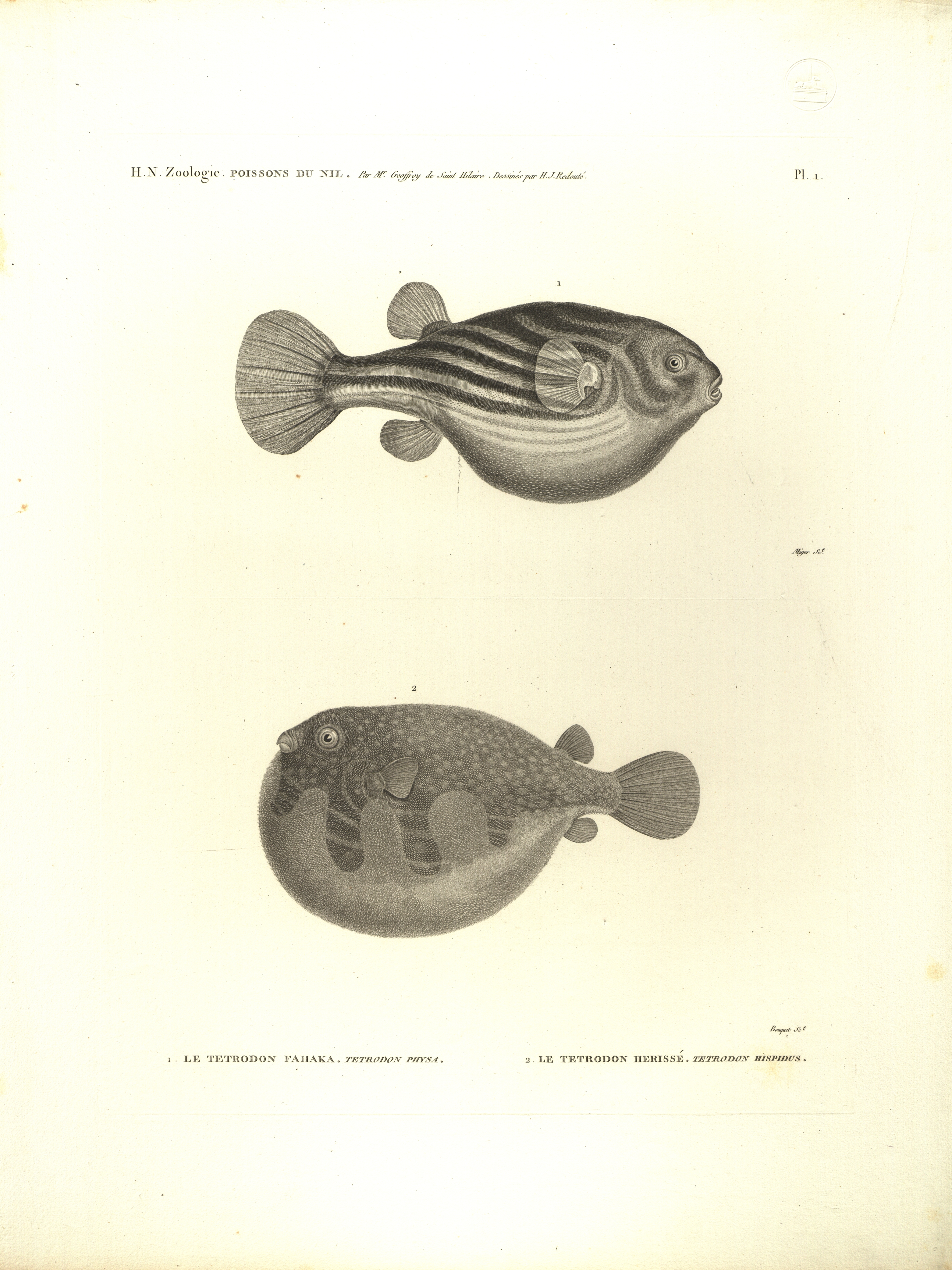 Description de l'Égypte, ou, Recueil des observations et des recherches qui ont été faites en Égypte pendant l'expédition de l'armée française. Poissons du Nil : [gravīra] / [autors] Geoffroy de Saint Hilaire, dessinés par H. J. Redouté, [1. zīm. gravētājs] Miger, [2. zīm. gravētājs] Bouquet. 2. izd. [Paris] : C.L.F. Panckouke, 1826. 1 lp. (2 m/b zīm.) ; plate 59x42,5 cm, lp. izmērs 71x54,5 cm. Histoire naturelle. Zoologie. Poissons du Nil ; vol. 1, pl. 1