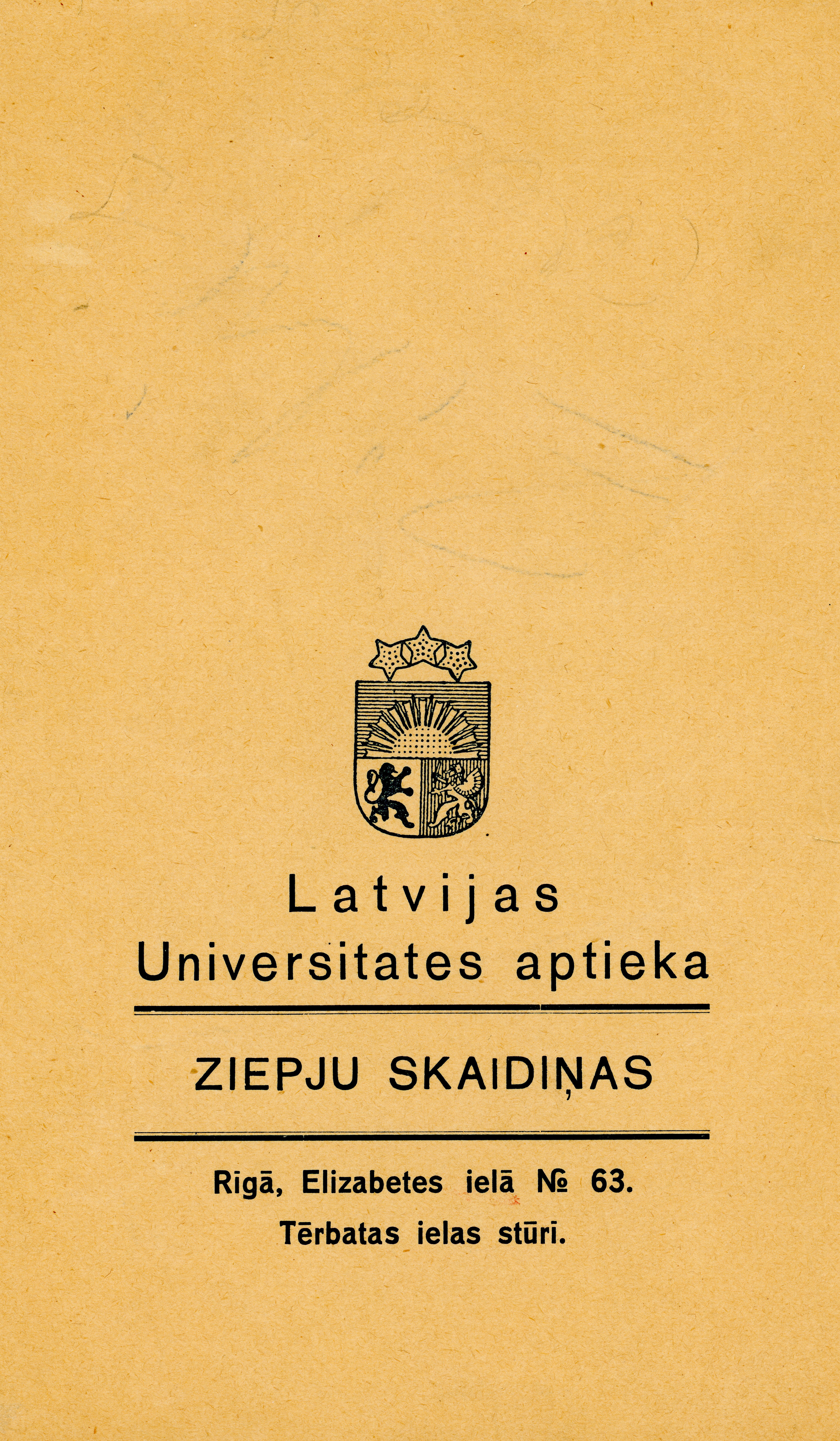 Latvijas Universitātes (LU) aptiekas gatavotu ziepju skaidiņu iepakojums. Uz iepakojuma attēlots Latvijas valsts ģerbonis un rakstīts - Latvijas Universitates aptieka un Rīgā, Elizabetes ielā 63 Tērbatas ielas stūrī. LU aptieka tika atvērta 1923. gadā Elizabetes ielā 63, Rīgā, kā normālaptieka un prakses vieta Ķīmijas fakultātes Farmācijas nodaļas studentiem. Tā pastāvēja līdz 1944. gadam. Ziepju skaidiņu iepakojums glabājas LU Muzeja LU vēstures kolekcijās.