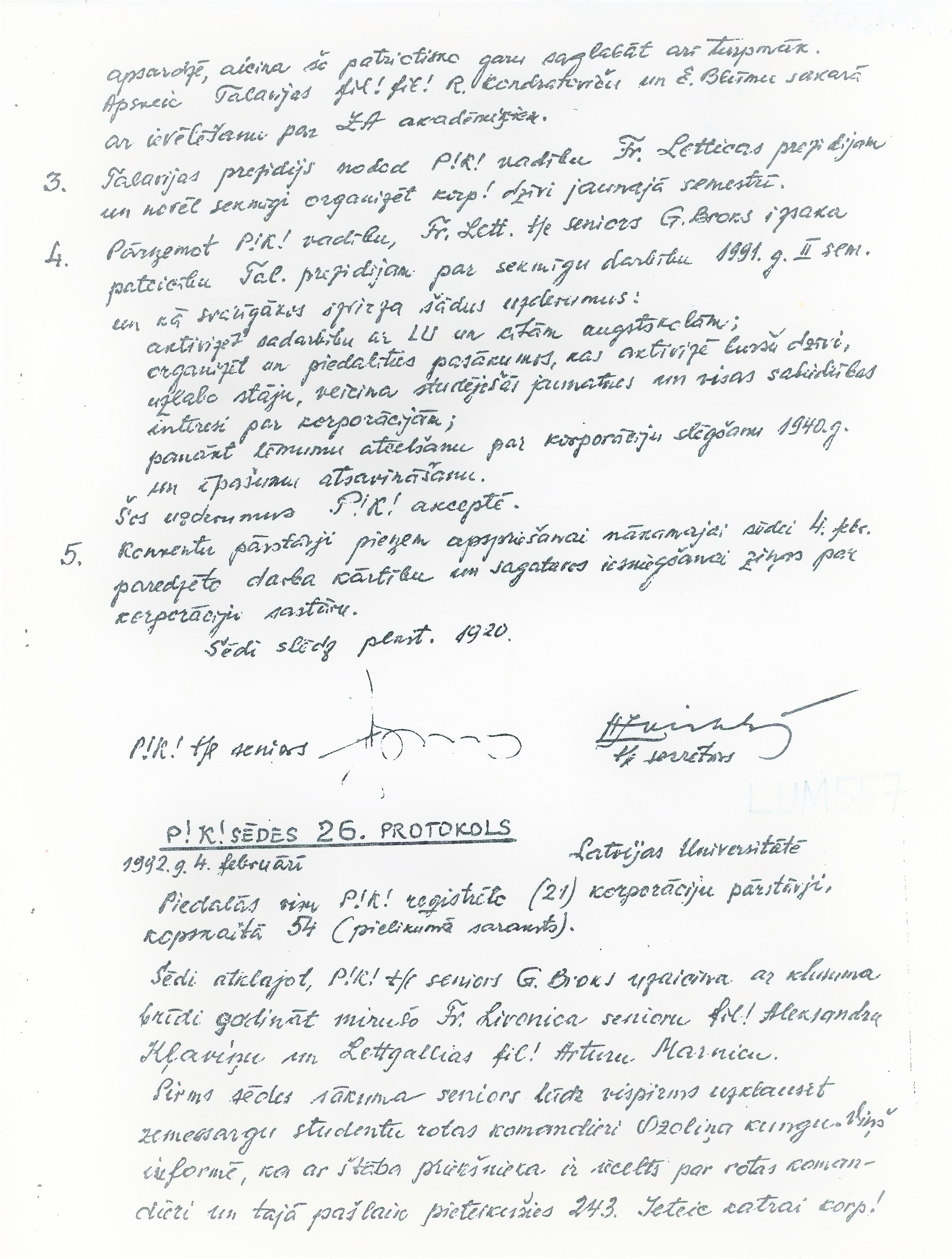 26th protocol of the 1992 1st semester Presidium Convent, describing the approval of 25th protocol, reports of officials, denationalisation of student fraternity property, organisation of the Latvian Union of Filister Societies and voting rights at meetings of the Presidium Convent.